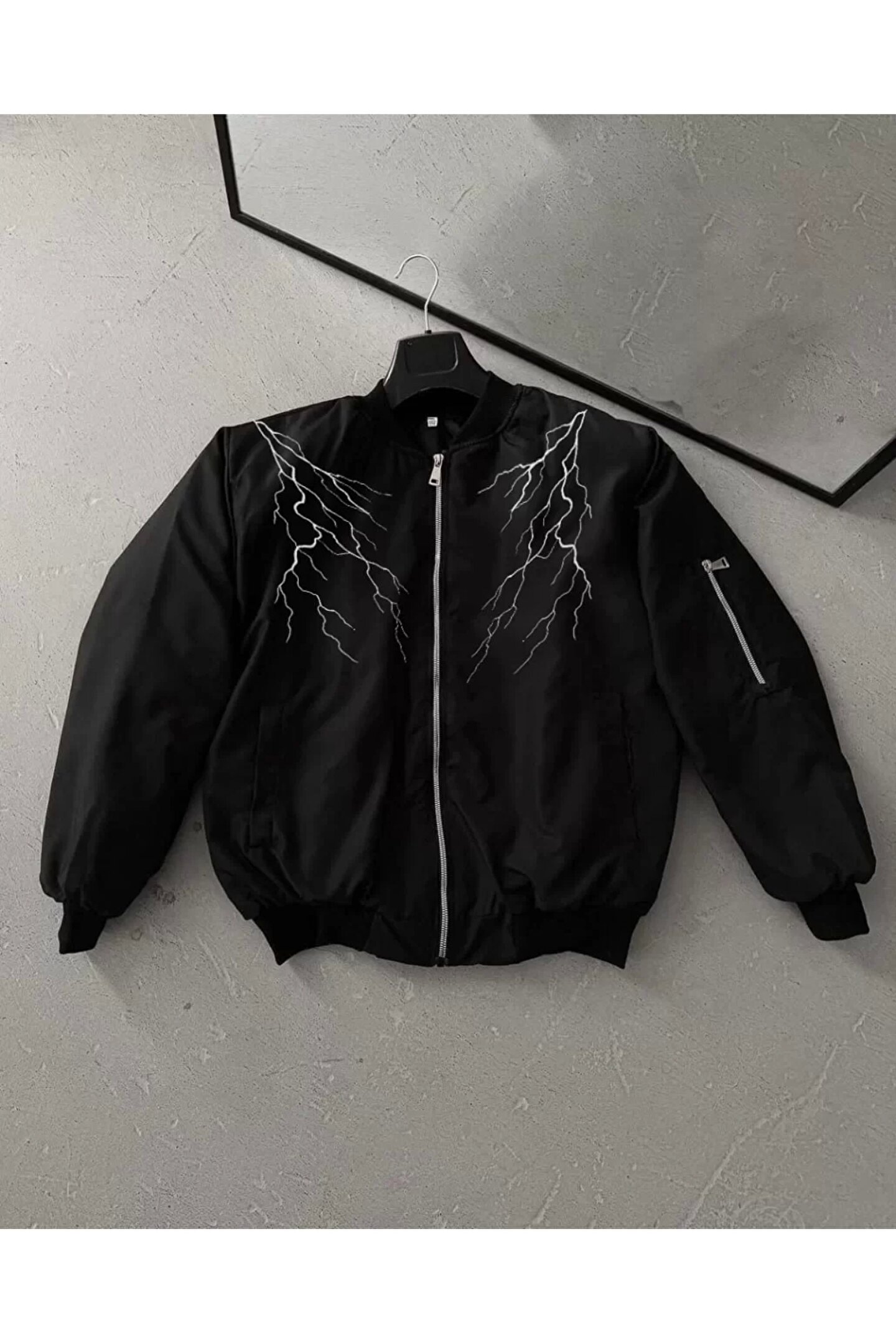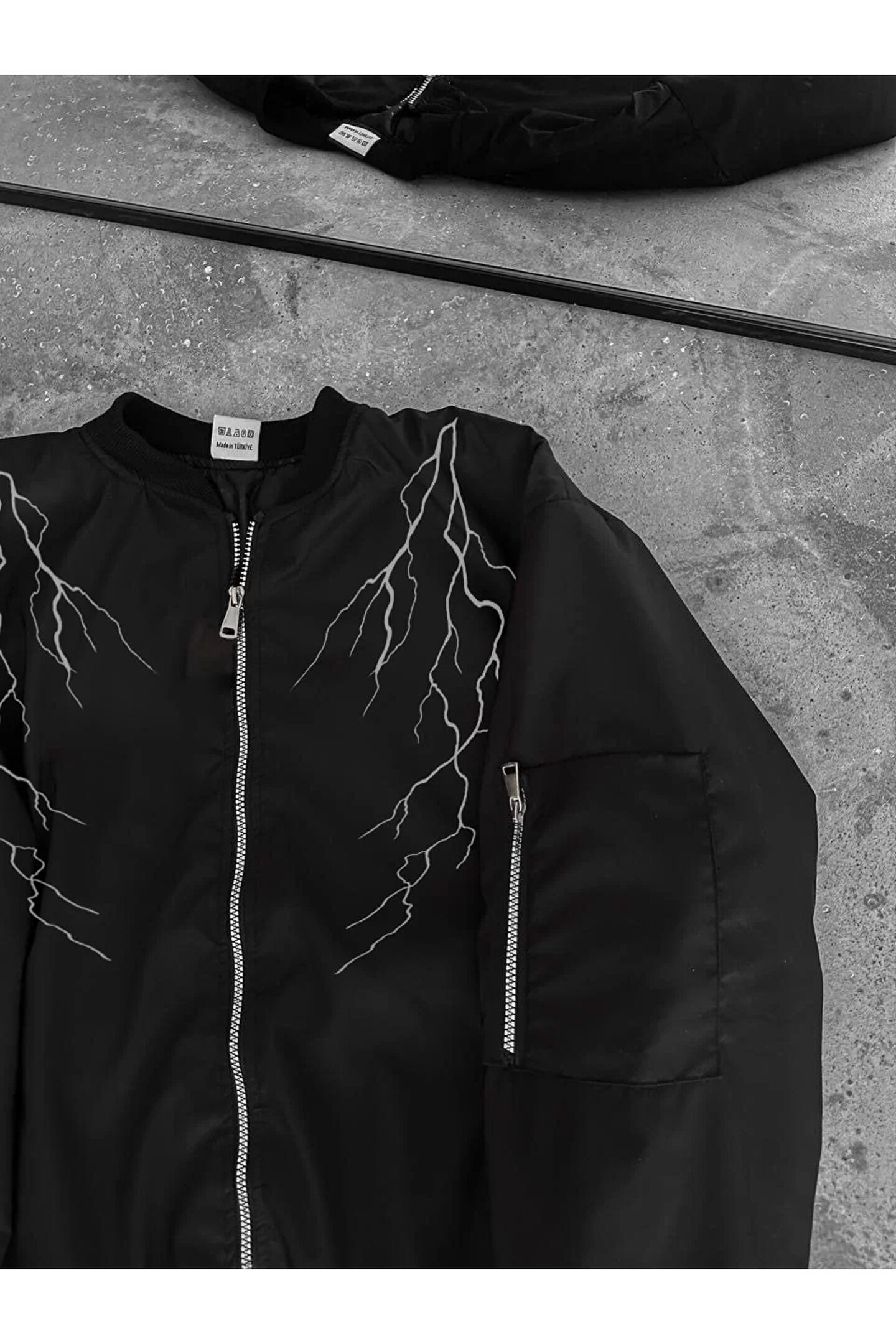 Yıldırım Baskılı Uzun Kol Bomber Ceket - Siyah