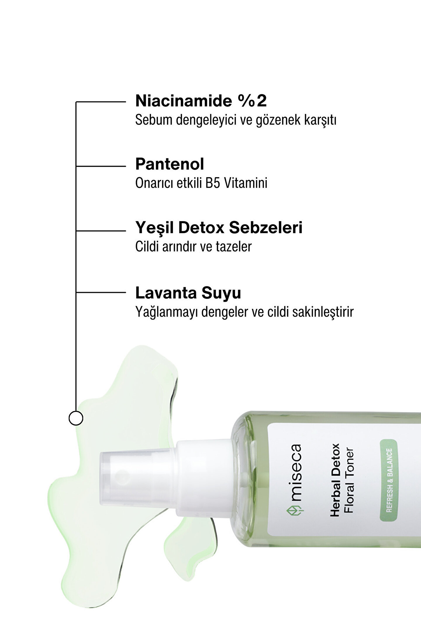 Temizleme aşamasından sonra cildi nemlendirir.; Cildin sebum dengesinin sağlanmasına katkı sağlar, yağlanmayı azaltır.; Gözeneklerin sıkılaşmasına destek olur.; %50'nin üzerinde doğal bitki suyu içerir.; Tüm ciltlere ve günlük kullanıma uygundur.; Ambalaj: 100 ml sprey cam şişe İçindekiler: Aqua (Saf Su), Lavandula Angustifolia Flower Water (Lavanta Suyu), Myrtus Communis Leaf Water (Mersin Yaprağı Suyu), Laurus Nobilis Leaf/Stem Water (Defne Suyu), Pentylene Glycol (Bitkisel Nemlendirici/Koruyucu), Glycerin (Bitkisel Nemlendirici), Niacinamide (B3 Vitamini), Camellia Sinensis Leaf Extract (Yeşil Çay Özü), Salix Alba Bark Extract (Söğüt Kabuğu Özü), Sodium Hyaluronate (Hyalüronik Asit) pH: 5,5-6,0 Kullanım: Gözleriniz ve ağzınız kapalı şekilde temiz yüzünüze pompa yardımıyla birkaç kez püskürtünüz.; İhtiyaca göre gün içerisinde 2-3 defa kullanılabilir.; Cilt sebum dengesinin sağlanmasına ve gözenek görünümünün azaltılmasına katkı sağlar.; Uyarılar: 25 derecenin altındaki oda sıcaklığında veya buzdolabında saklayınız.; Göz ile temasından kaçınınız, temas halinde bol su ile yıkayınız.; Kullanmadan önce alerji testi yapınız.; Haricen kullanılır.