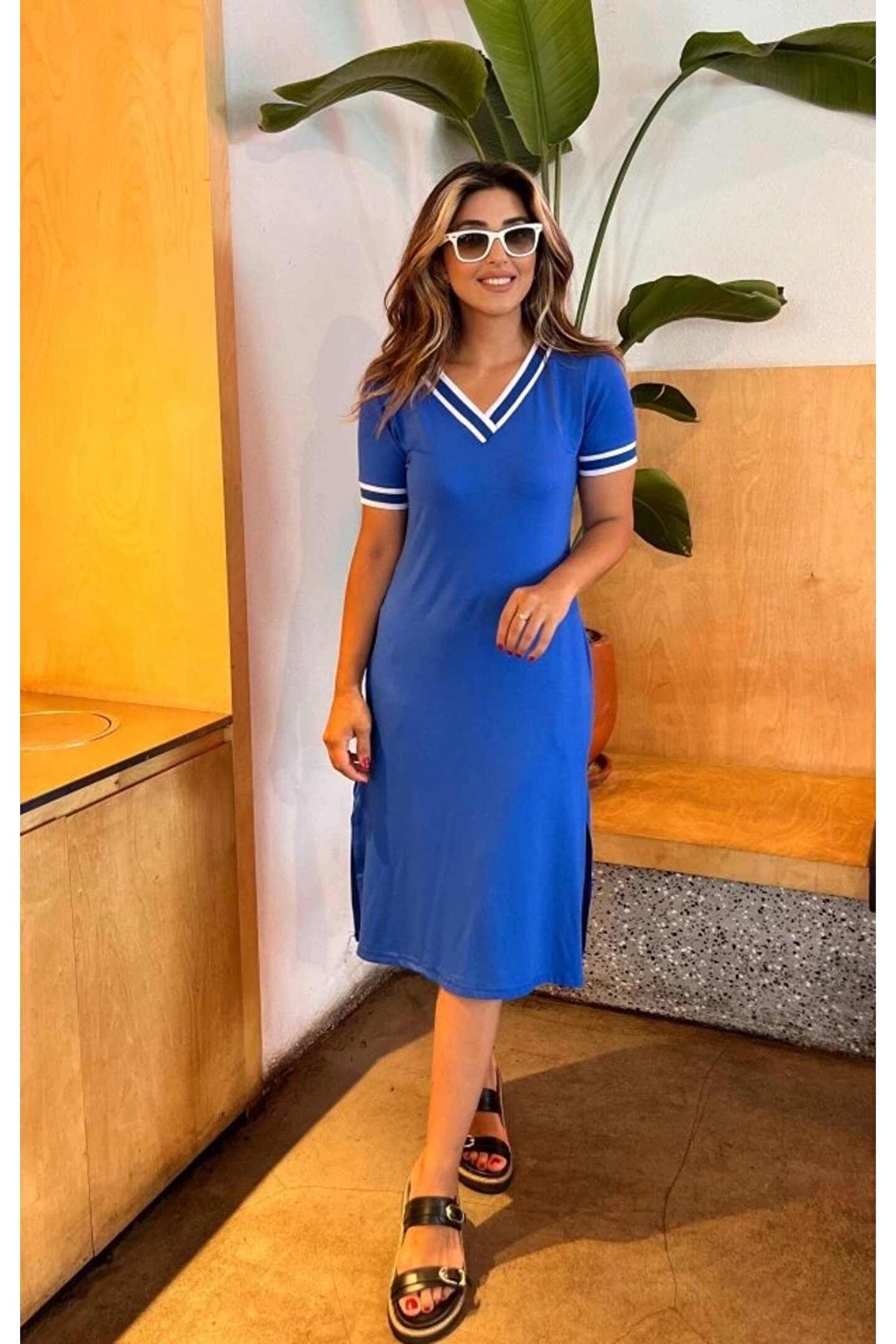 MissRunin Kadın Kısa Kollu V Yaka Ve Yaka Ribana Detay Midiboy Viskon Elbise