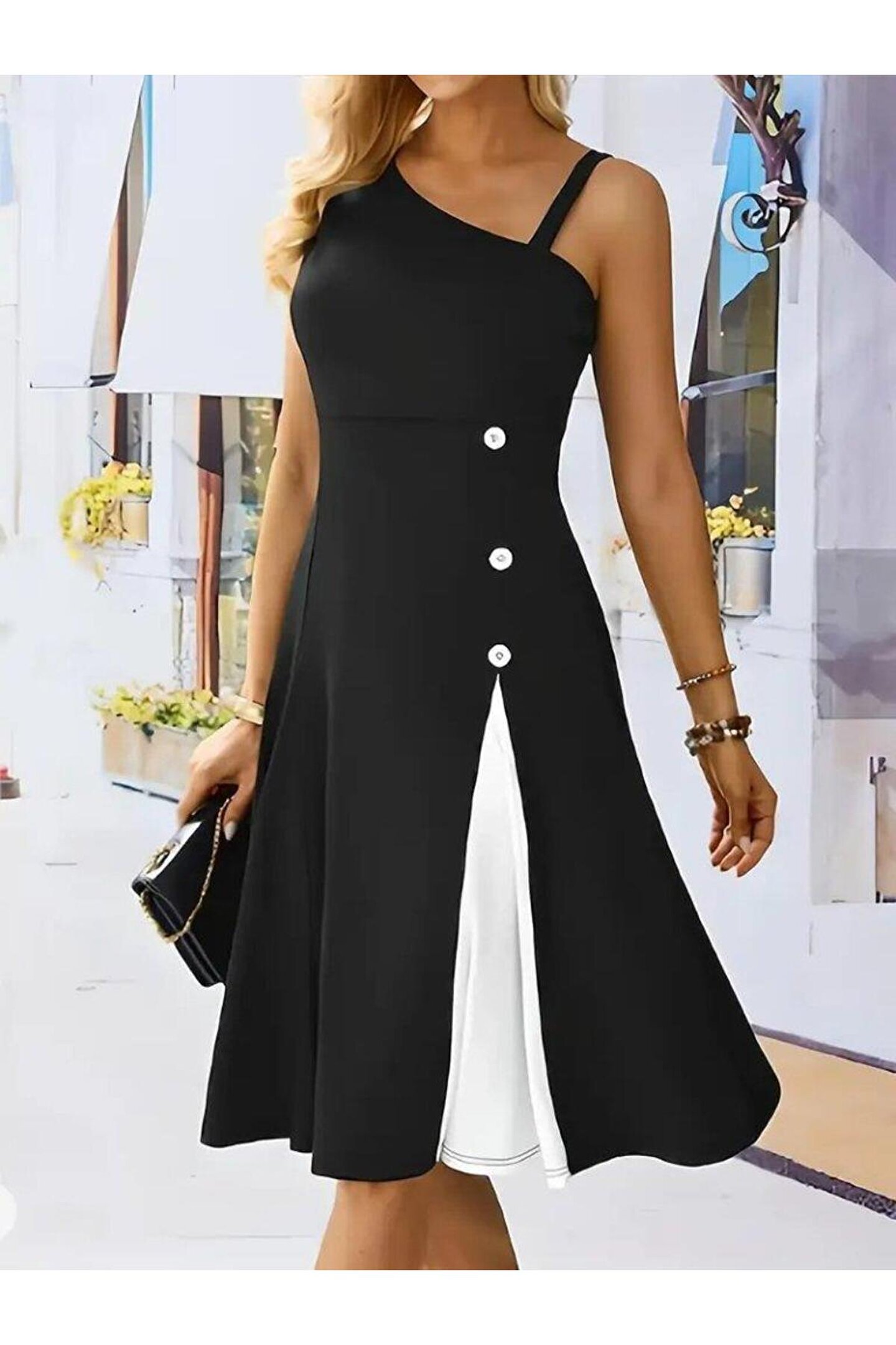 Kadın Tek Omuzu şerit Detaylı Sıfır Kol Yandan Düğme Detaylı Janjan Krep Elbise