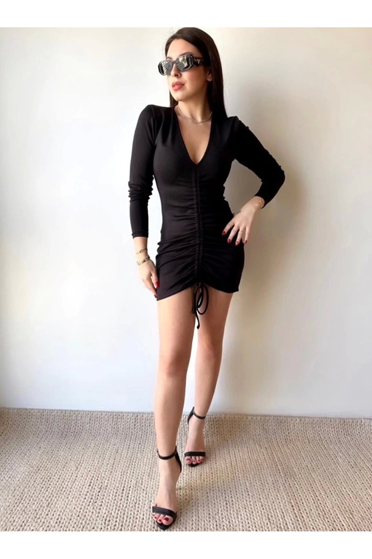 Kadın V Yaka önü Asansör Büzgü Detay Fırsat ürün Mini Elbise