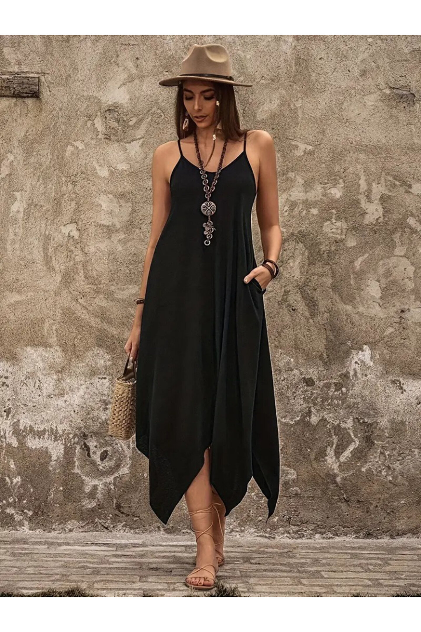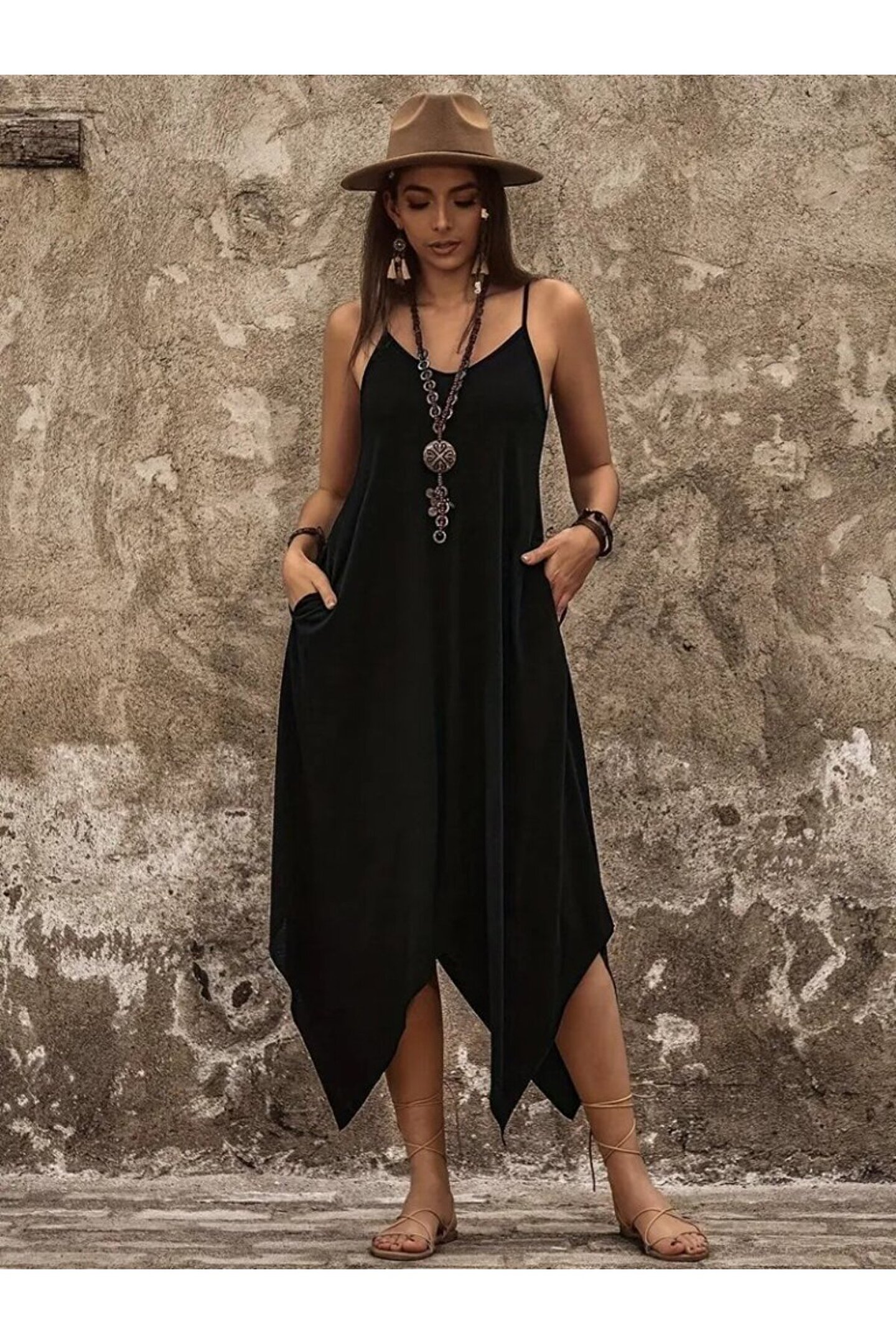 Kadın Askılı V Yakalı Cep Detaylı Asimetrik Kesim Detaylı Viskon Elbise