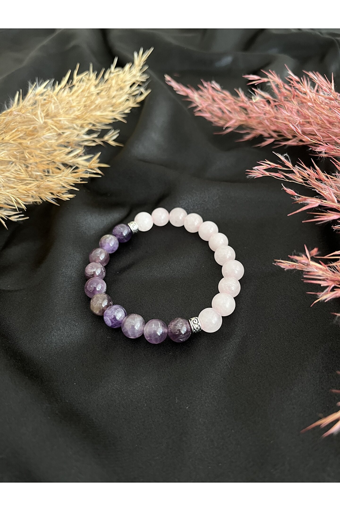 Ametist ve Pembe kuvars taşlarının birlikte kullanımı, estetik açıdan oldukça uyumlu olduğu gibi, güçlü bir enerji ortaya çıkarır.; ; Ametist taşı, depresyonu hafifletir ve anksiyete ile başa çıkmayı kolaylaştırır.; ; Pembe kuvars taşı ise, öz sevgiyi teşvik eden, sevgi enerjisi ile dolu bir kristaldir.; ; ÜRÜN BİLGİSİ: Bileklik 8 mm Ametist ve Pembe kuvars doğal taşlarının muhteşem uyumuyla tasarlanmıştır.; ; Taşlarımız gerçek doğal taştır.; ; Doğal taşlar tabiatı itibariyle kendine özgü biçimdedir ve aynı taş cinslerinde dahi ufak tefek renk tonu ve biçim farklılıkları görülebilir.; ; Bu taşın doğadaki doğal oluşumuyla ilgilidir.; ; Belli aralıklarla topraklama yöntemiyle taşınızın enerjisini temizleyip taşlarınızı arındırabilirsiniz.;