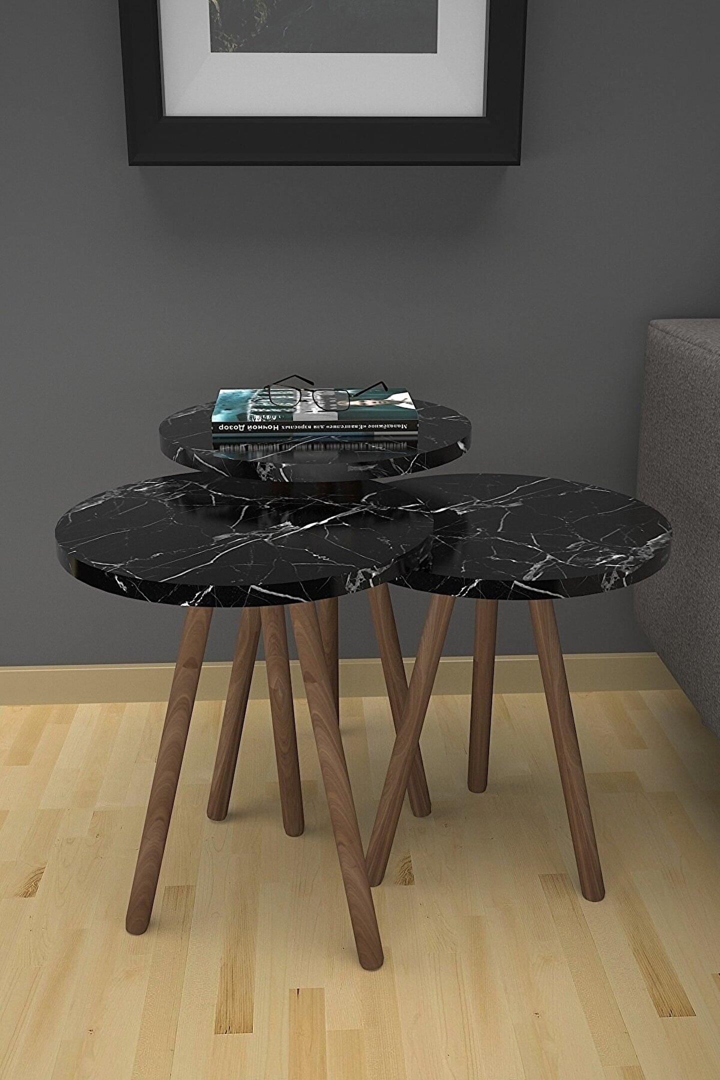 3’lü Yuvarlak Zigon Sehpa Takımı – Ahşap Ayaklı, Modern Tarz, Kahve Ve Sunum Sehpası Siyah Mermer