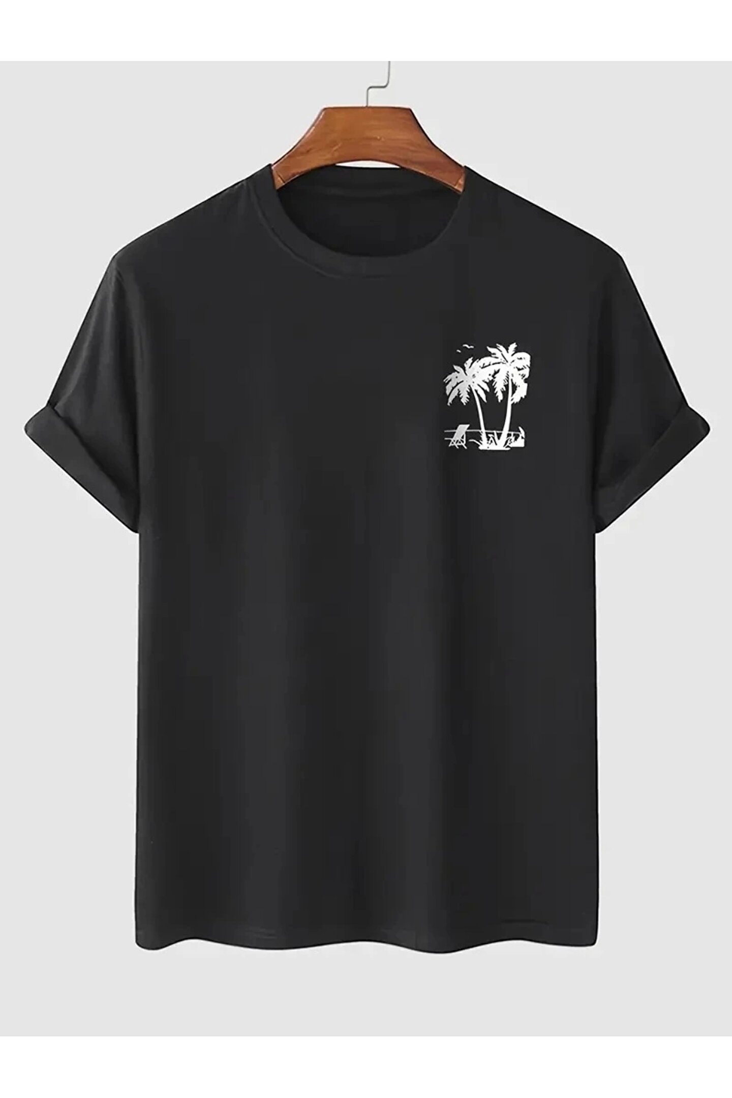 MODA 201 Penye Compack Palmiye Ön Baskılı Oversize Bisiklet Yaka Kısa Kol Yazlık T-shirt - Siyah