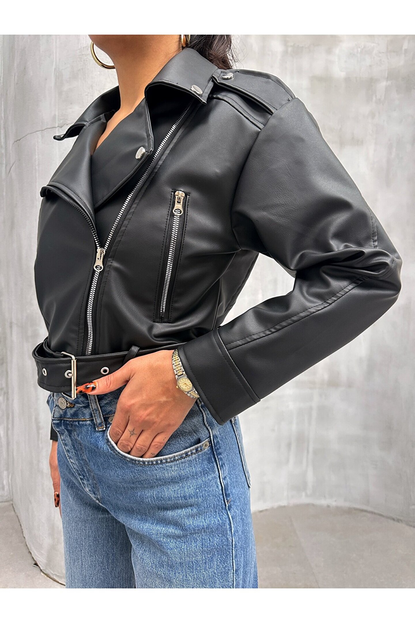 moda armanc Bel Kemer Detaylı Crop Biker Deri Ceket