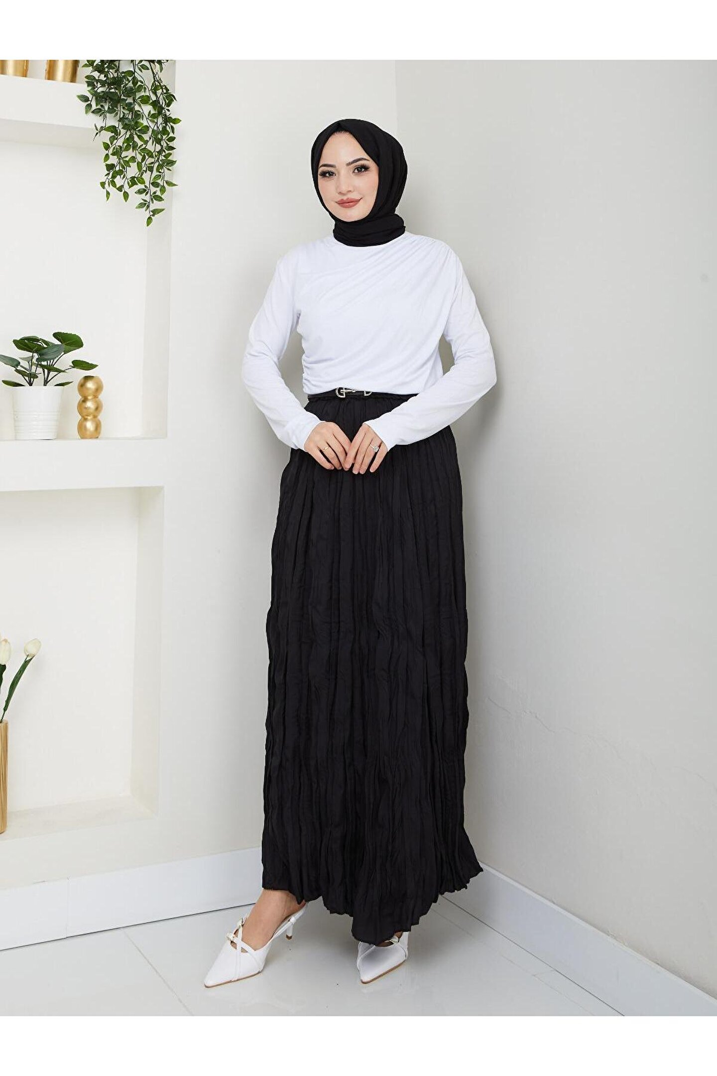 Beli Lastikli Buruşuk Mikro Uzun Kadın Etek