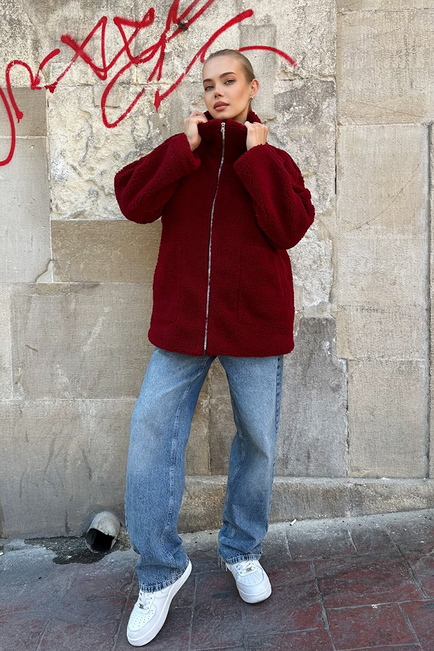 Klasik montlardan sıkıldıysan, bordo rengiyle dikkat çeken bu kadın peluş mont tam aradığın parça olabilir.; ; Yumuşacık dokusu, sıcacık tutan kumaşı ve oversize kalıbıyla hem rahatlığı hem de sokak stilini bir araya getiriyor.; ; Fermuarlı kapanışı, derin cepleri ve salaş duruşu sayesinde günlük kombinlerinden şehir gezilerine kadar her anına eşlik etmeye hazır.; ; Peluş Yumuşaklığı: Giydiğin an konforu hissettiren özel doku.; ; Oversize Rahatlık: Kat kat giyime uygun, özgürce hareket alanı.; ; Geniş Cepli & Fermuarlı: Hem şıklık hem işlevsellik.; ; Bordo Renk Etkisi: Zarif, dikkat çekici ve zamansız.; ; Ürün Boyu: 75 CM (Hem rahat hem kapatıcı bir kullanım sunar;kalçayı kapatır, soğuk havalarda tam koruma sağlar.; ) ; Manken Ölçüleri: Boy: 1.70 Göğüs:90 Bel:63 Kalça:89 cm (Üzerindeki ürün 38 (S) bedendir) ;