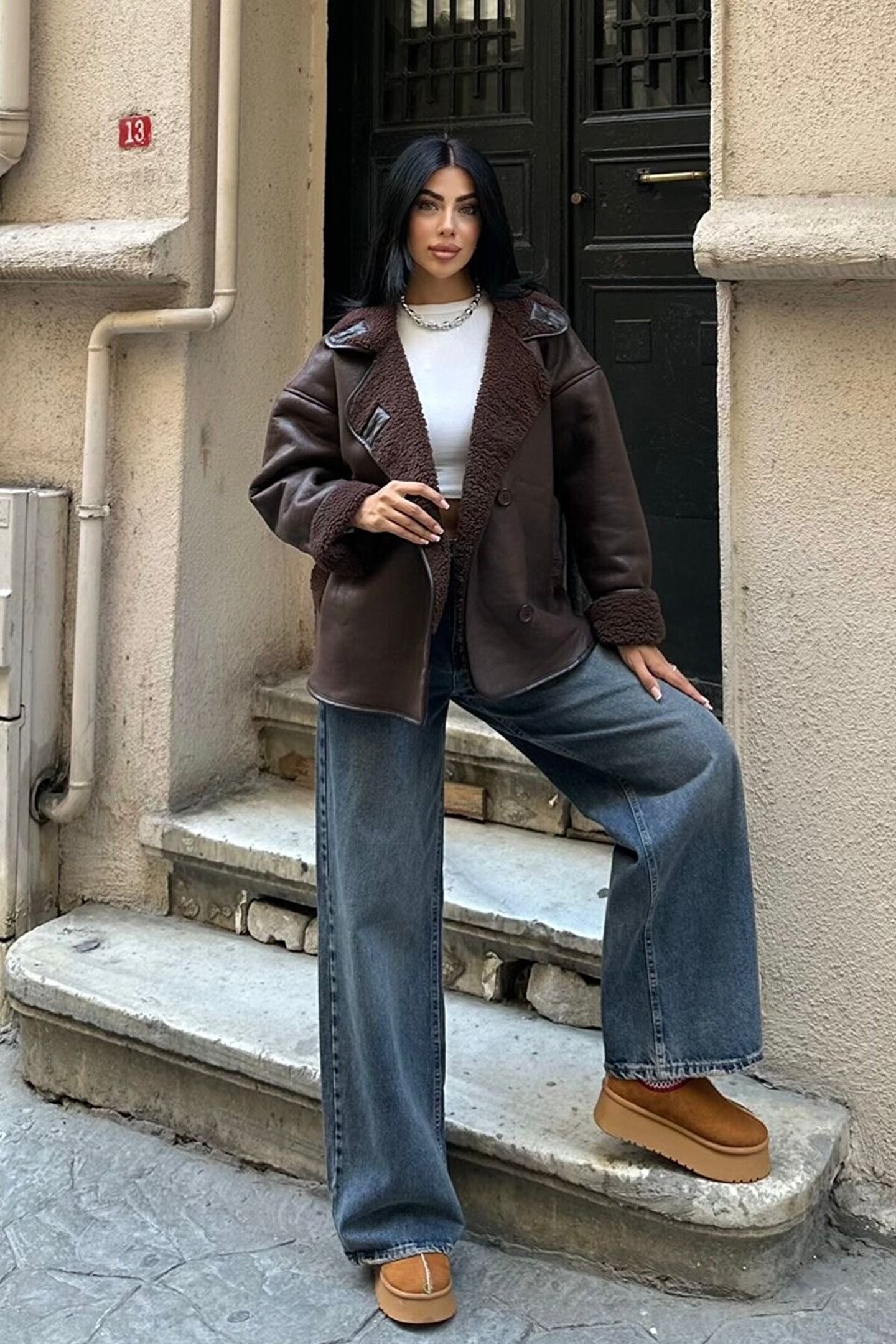 moda armanc Else Acı Kahve Dokulu Süet Içi Peluşlu Oversize Zr Model Mont