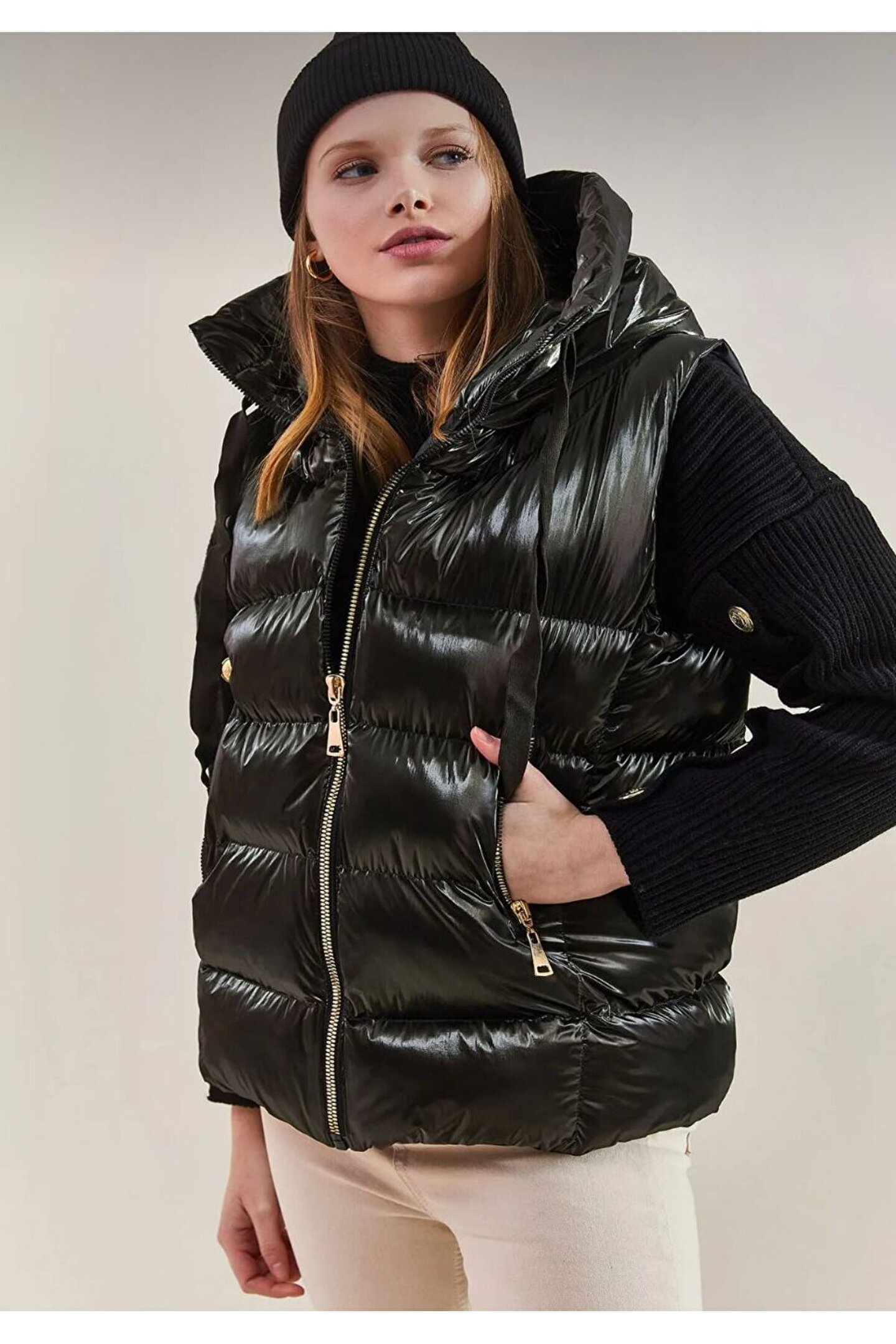 -Ürün Boyu 70 cm.; - Zarif gold detaylarıyla süslenmiş siyah şişme yelek, ilkbahar ve sonbahar mevsimlerinde şıklığınızı tamamlar.; - Pratik kullanım sunan çift cepli tasarımı ile günlük eşyalarınızı yanınızda taşımanız kolaylaşır.; - Tekli paket içeriği sayesinde ihtiyacınıza göre rahatça tercih edebilirsiniz.; - Astarlı yapısı ile konforlu bir kullanım sağlarken, yoğun elyaf dolgusu soğuk havalarda ekstra sıcaklık sunar.; - Elyaflı dolgu tekniği, dayanıklılığı artırarak uzun süreli kullanım imkanı tanır.; - %90 polyester ve %10 likra karışımından oluşan materyal bileşeni esneklik kazandırırken formunu korur.; - Sürdürülebilirlik detayının bulunmamasına rağmen, genç koleksiyonuna ait tasarım anlayışını yansıtır.; - Kemersiz yapısıyla modern ve minimalist bir görünüm sergilerken, fermuarlı kapama şekli pratik kullanım vaat eder.; - Type 2 yıkama talimatına uygun şekilde temizlenmesi önerilir; böylece ürününüz daha uzun ömürlü olur.; - Astarlı olması sayesinde rüzgar geçirmez özelliğiyle kötü hava koşullarında bile koruma sağlar.; - Micro dokuma tipi hafifliğiyle hareket özgürlüğünüzü kısıtlamaz; orta kalınlığındaki siluetiyle ideal bir denge sunar.; - Relaxed kalıp ile rahat bir oturuşa sahip olan bu yelek, her vücut tipine uyum sağlar.; - Türkiye menşeli olmasıyla yerel üretim avantajlarından faydalanabilirsiniz.; - Dokuma kumaş tipi dayanıklılığı arttırarak ürünün estetik duruşunu korur.; - Genç yaş grubuna hitap eden dinamik tarzıyla dikkat çeker; gündüzden geceye her ortama uyum sağlar.; - Standart kol boyu ve renk bloklu deseniyle trendleri takip eden stil sahibi görünmenizi sağlar.; - Kolsuz tasarım sayesinde serin günlerde de rahatça giyilebilir; fermuarlı kapama mevcuttur.;