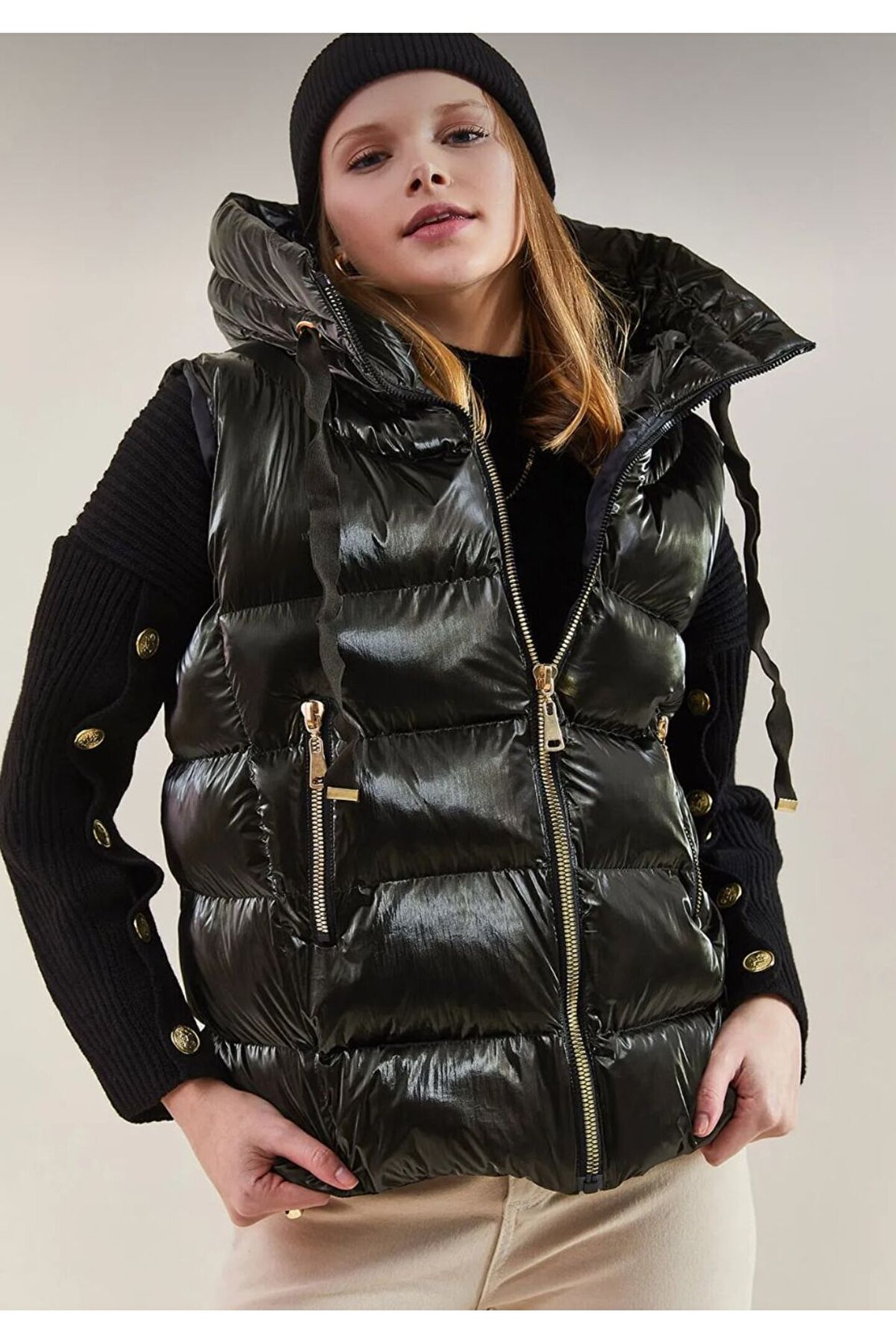 -Ürün Boyu 70 cm.; - Zarif gold detaylarıyla süslenmiş siyah şişme yelek, ilkbahar ve sonbahar mevsimlerinde şıklığınızı tamamlar.; - Pratik kullanım sunan çift cepli tasarımı ile günlük eşyalarınızı yanınızda taşımanız kolaylaşır.; - Tekli paket içeriği sayesinde ihtiyacınıza göre rahatça tercih edebilirsiniz.; - Astarlı yapısı ile konforlu bir kullanım sağlarken, yoğun elyaf dolgusu soğuk havalarda ekstra sıcaklık sunar.; - Elyaflı dolgu tekniği, dayanıklılığı artırarak uzun süreli kullanım imkanı tanır.; - %90 polyester ve %10 likra karışımından oluşan materyal bileşeni esneklik kazandırırken formunu korur.; - Sürdürülebilirlik detayının bulunmamasına rağmen, genç koleksiyonuna ait tasarım anlayışını yansıtır.; - Kemersiz yapısıyla modern ve minimalist bir görünüm sergilerken, fermuarlı kapama şekli pratik kullanım vaat eder.; - Type 2 yıkama talimatına uygun şekilde temizlenmesi önerilir; böylece ürününüz daha uzun ömürlü olur.; - Astarlı olması sayesinde rüzgar geçirmez özelliğiyle kötü hava koşullarında bile koruma sağlar.; - Micro dokuma tipi hafifliğiyle hareket özgürlüğünüzü kısıtlamaz; orta kalınlığındaki siluetiyle ideal bir denge sunar.; - Relaxed kalıp ile rahat bir oturuşa sahip olan bu yelek, her vücut tipine uyum sağlar.; - Türkiye menşeli olmasıyla yerel üretim avantajlarından faydalanabilirsiniz.; - Dokuma kumaş tipi dayanıklılığı arttırarak ürünün estetik duruşunu korur.; - Genç yaş grubuna hitap eden dinamik tarzıyla dikkat çeker; gündüzden geceye her ortama uyum sağlar.; - Standart kol boyu ve renk bloklu deseniyle trendleri takip eden stil sahibi görünmenizi sağlar.; - Kolsuz tasarım sayesinde serin günlerde de rahatça giyilebilir; fermuarlı kapama mevcuttur.;