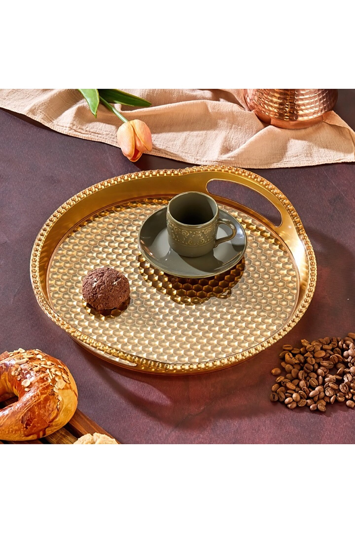 moda armanc Gold Petek Desenli Kulplu Yuvarlak Sunum Tepsisi