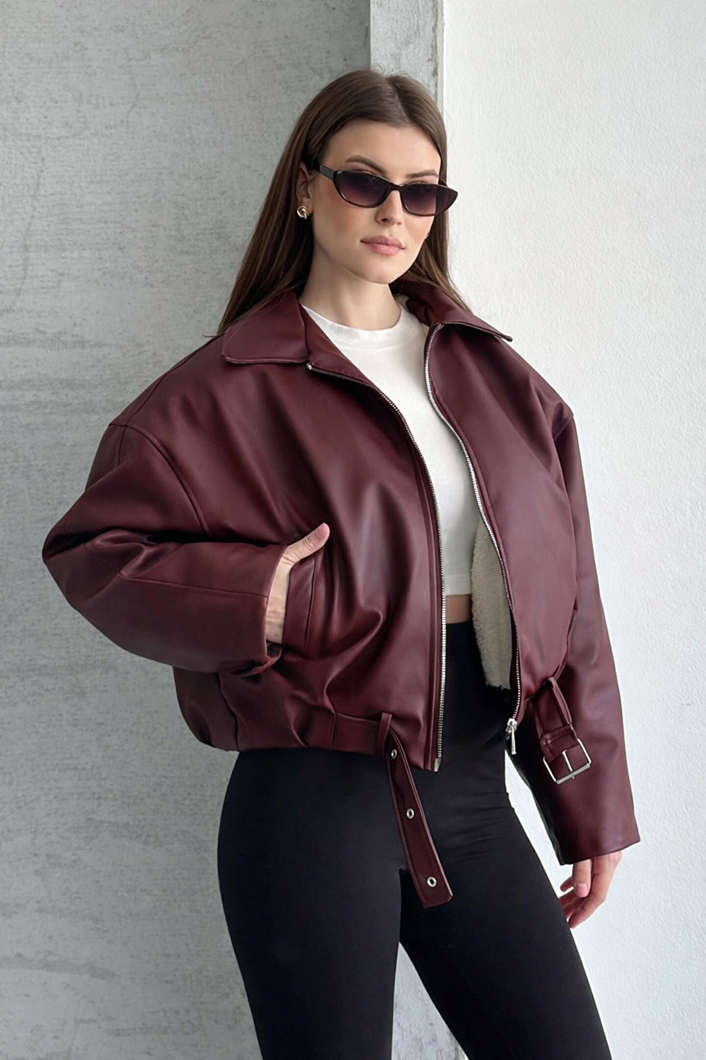 Şıklığı ve konforu bir arada sunan kadın bordo suni deri ceket, modern tasarımı ve sıcak tutan peluş astarı ile soğuk havalarda stilinizin vazgeçilmezi olur.