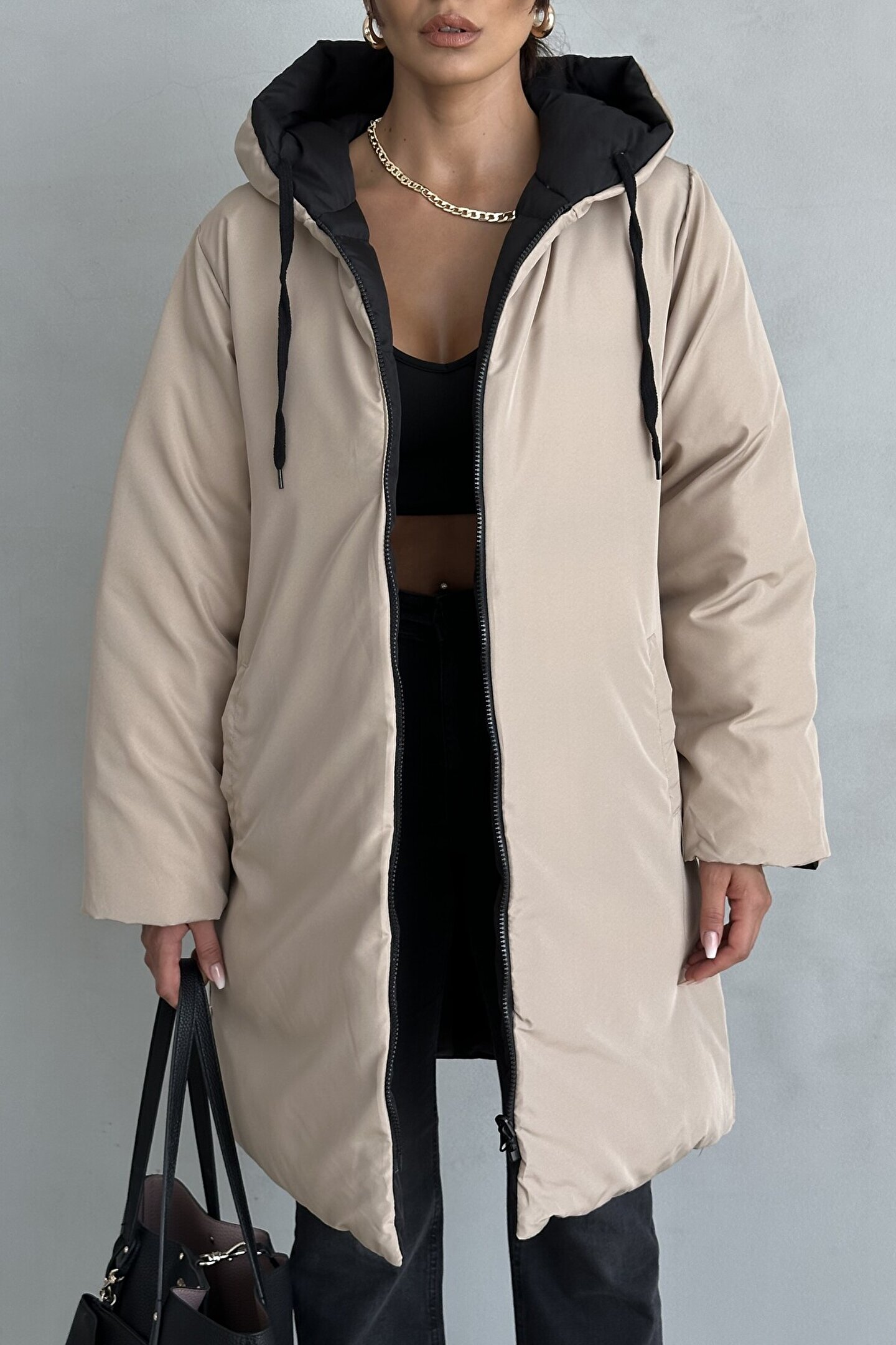 Bir yüzü bej, diğer yüzü siyah olan mont sayesinde tek ürünle iki farklı stil yaratabilirsiniz.