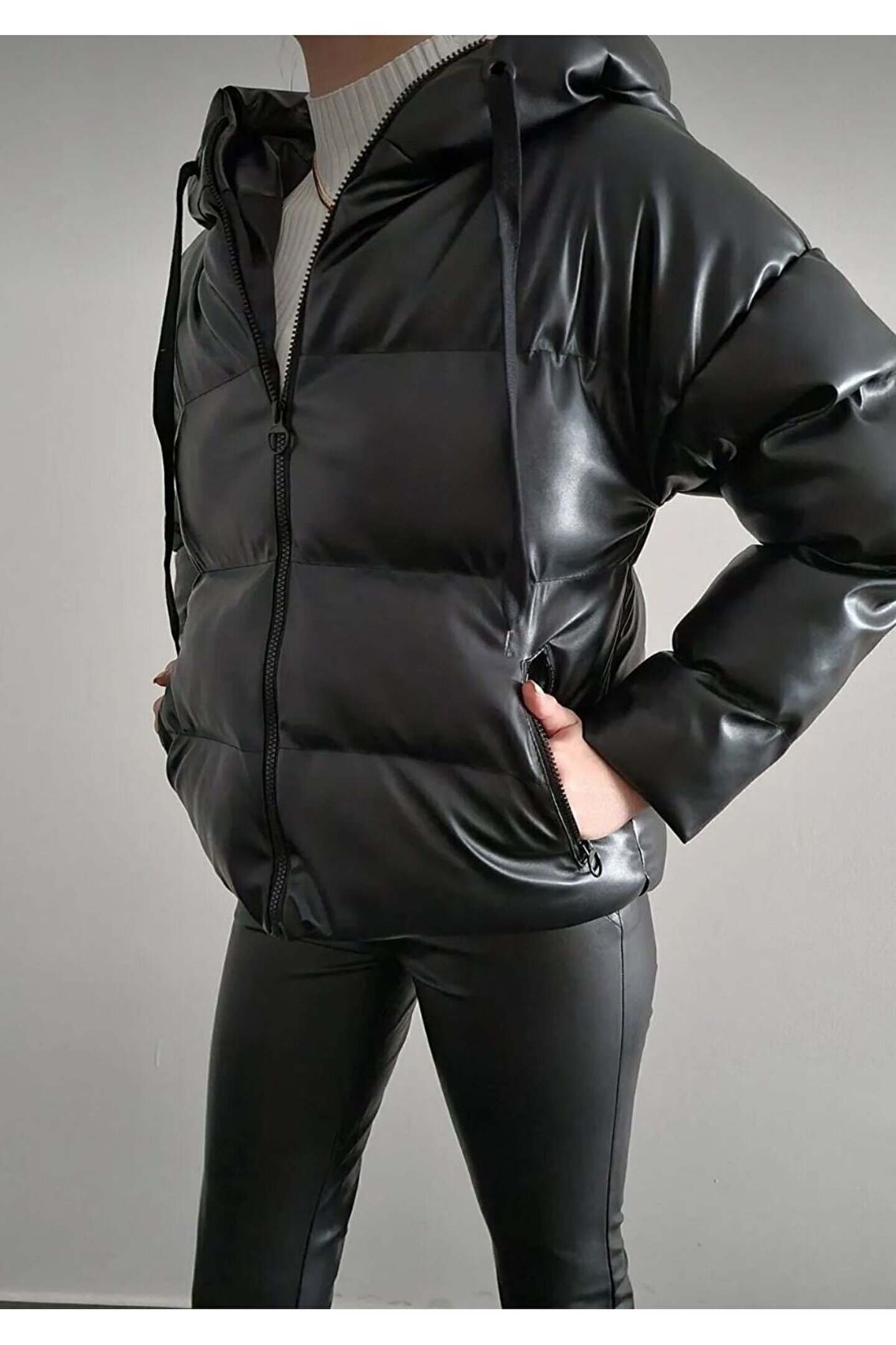 moda armanc Kadın Deri Kapüşonlu Siyah Şişme Mont