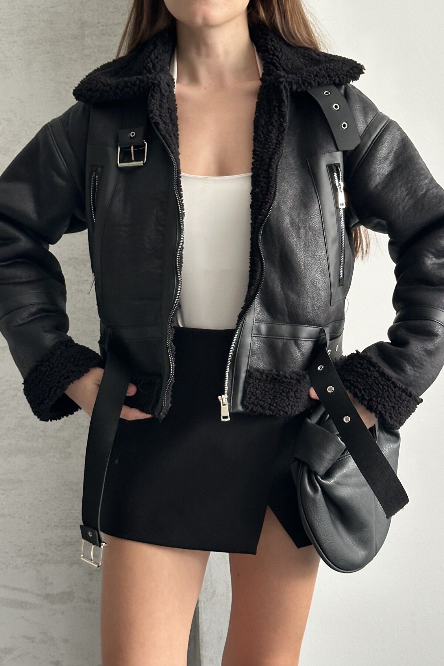 • İçi tamamen kürklü yapısı, kemer ve fermuar detaylarıyla aviator/biker tarzını günlük kombinlerine taşıyor.