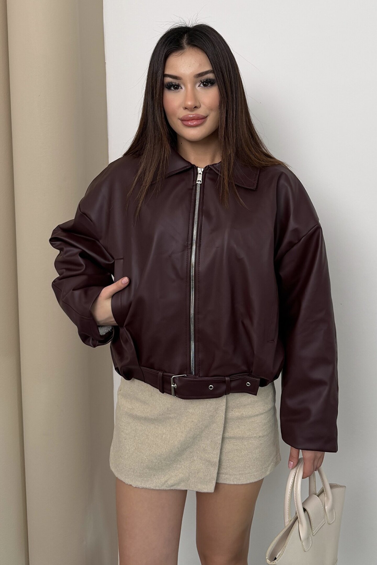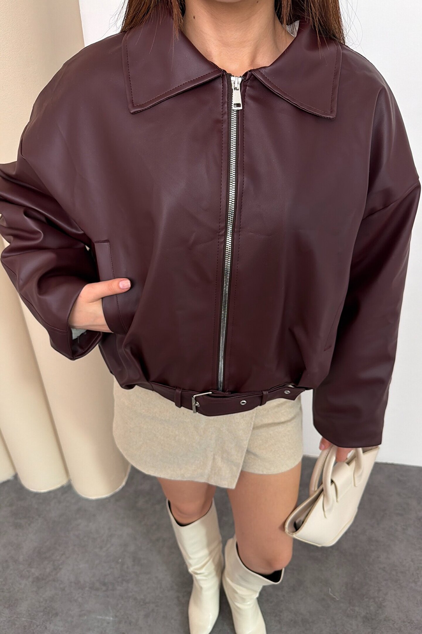 Kış aylarında soğuktan korunmak için ideal, içi kürklü ve su itici özelliklere sahip oversize deri ceket.