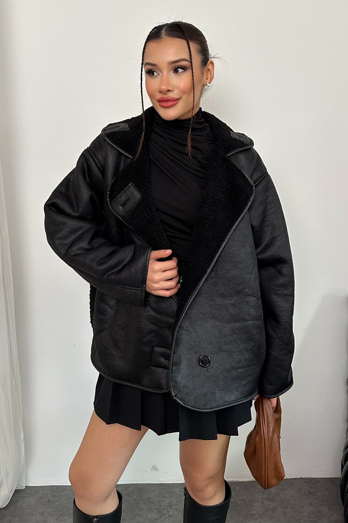 moda armanc Kadın İçi Peluş Kürklü Oversize Suni Deri Mont - Else Lamine Süet Ceket