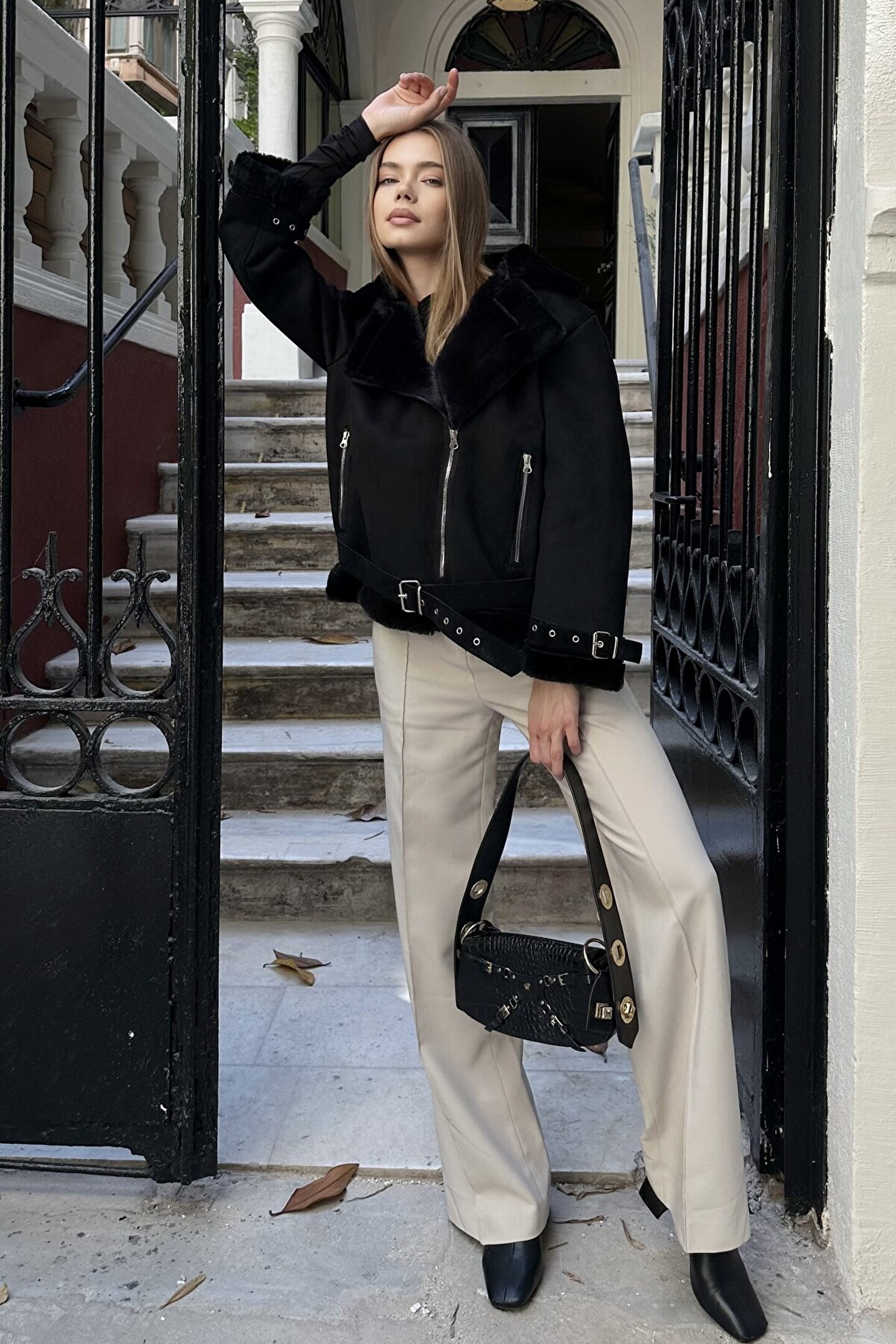 moda armanc Kadın Içi Rapitli Kemer Detaylı Süet Mont