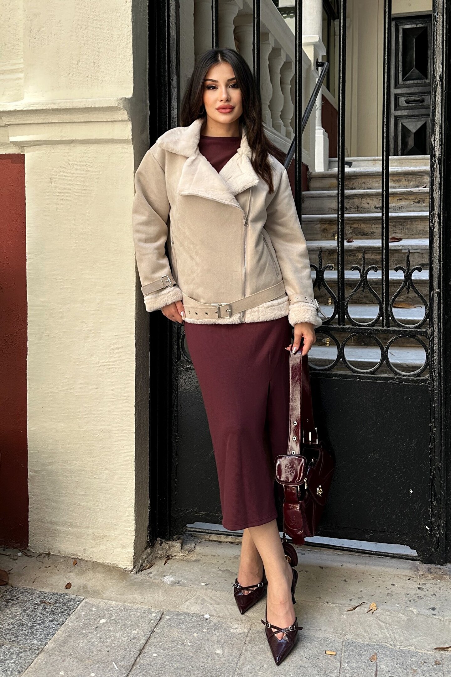 moda armanc Kadın Içi Rapitli Kemer Detaylı Zr Deri Süet Mont