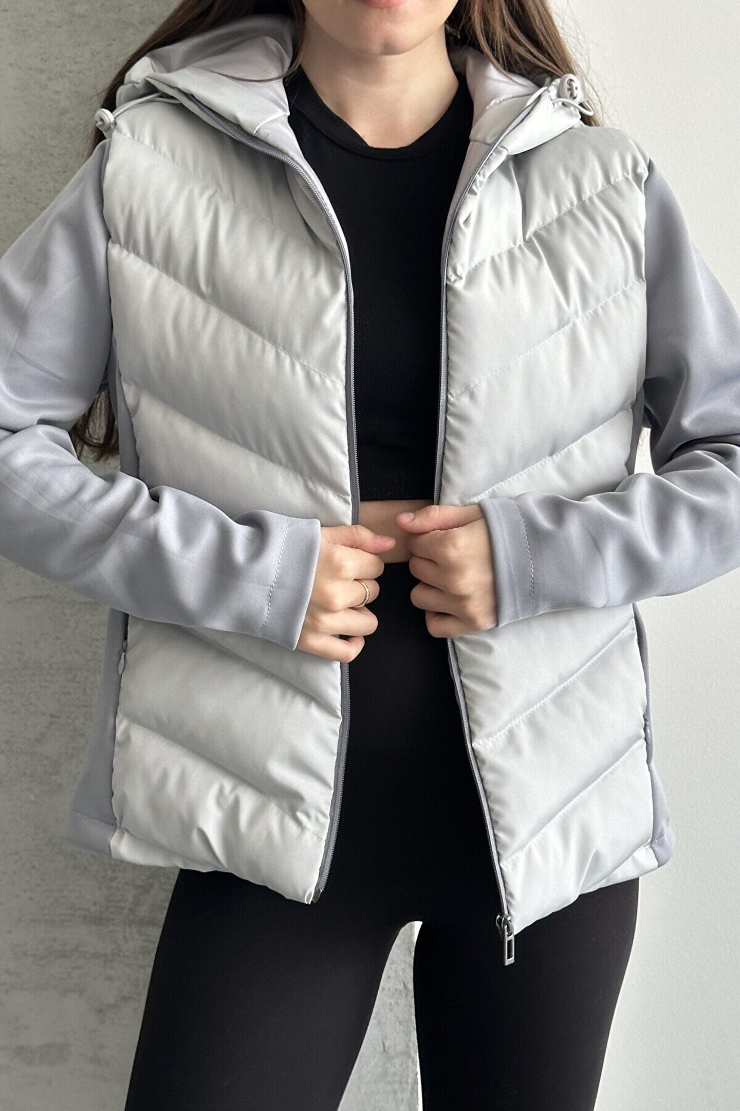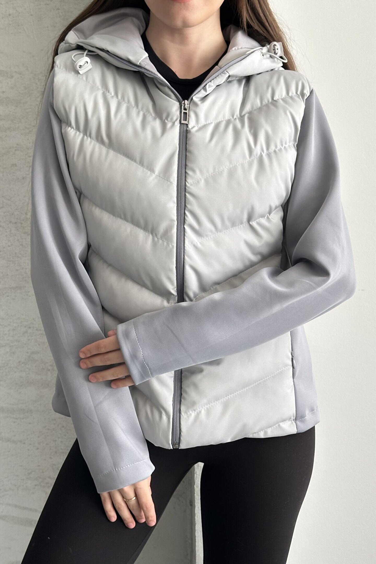 moda armanc Kadın Kapüşonlu Şişme Mont - Su Geçirmez Basic Günlük Kontrast Gri Ceket