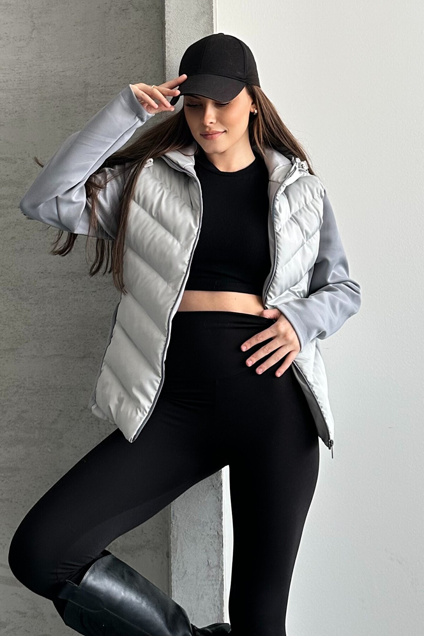 Kadın gri kapüşonlu şişme mont, minimal ve şehir stiline uyum sağlayan tasarımıyla sezonun en çok tercih edilen basic mont modelleri arasında yer alıyor.
