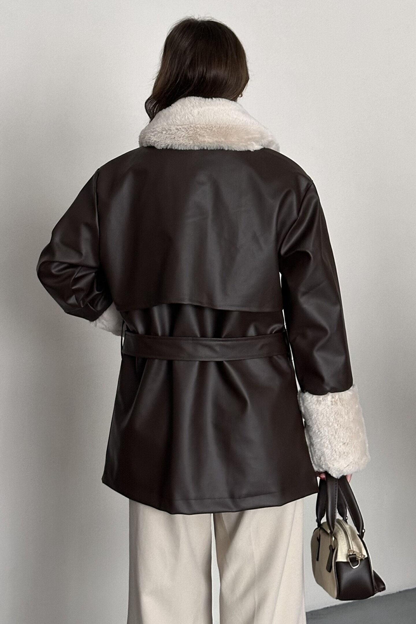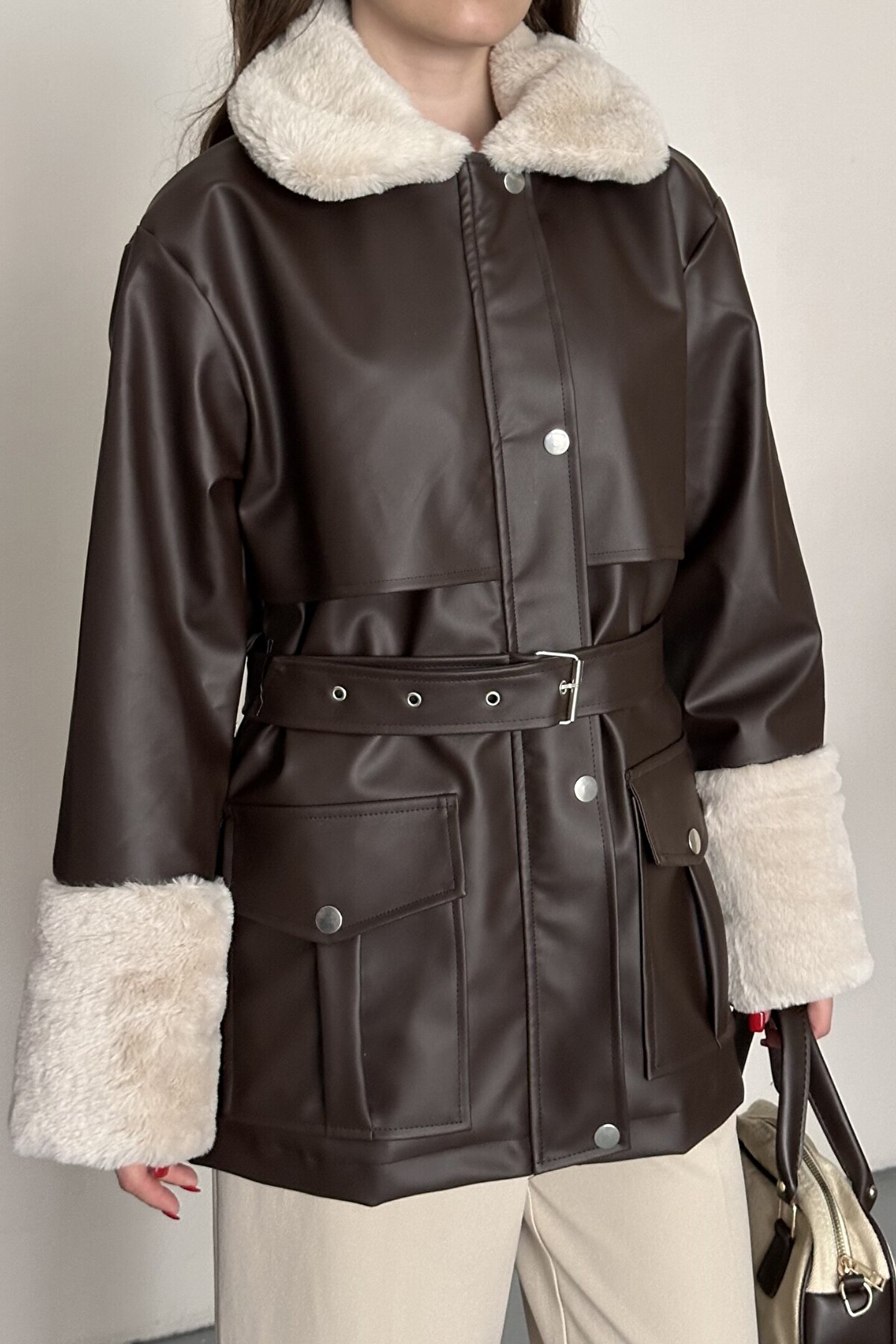 moda armanc Kadın Kürk Detaylı Kemerli Deri Mont Astarlı Uzun Suni Deri Kaban