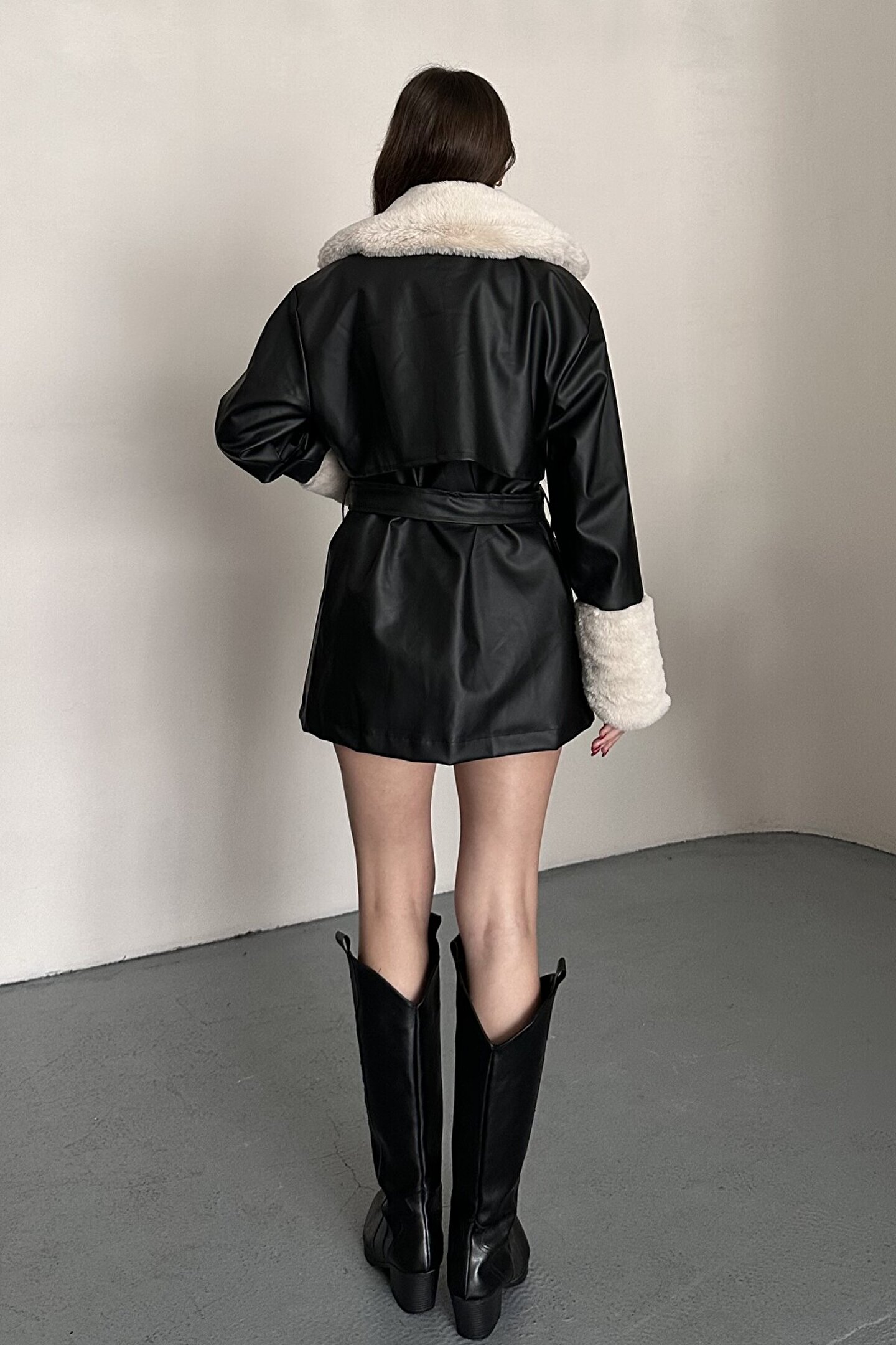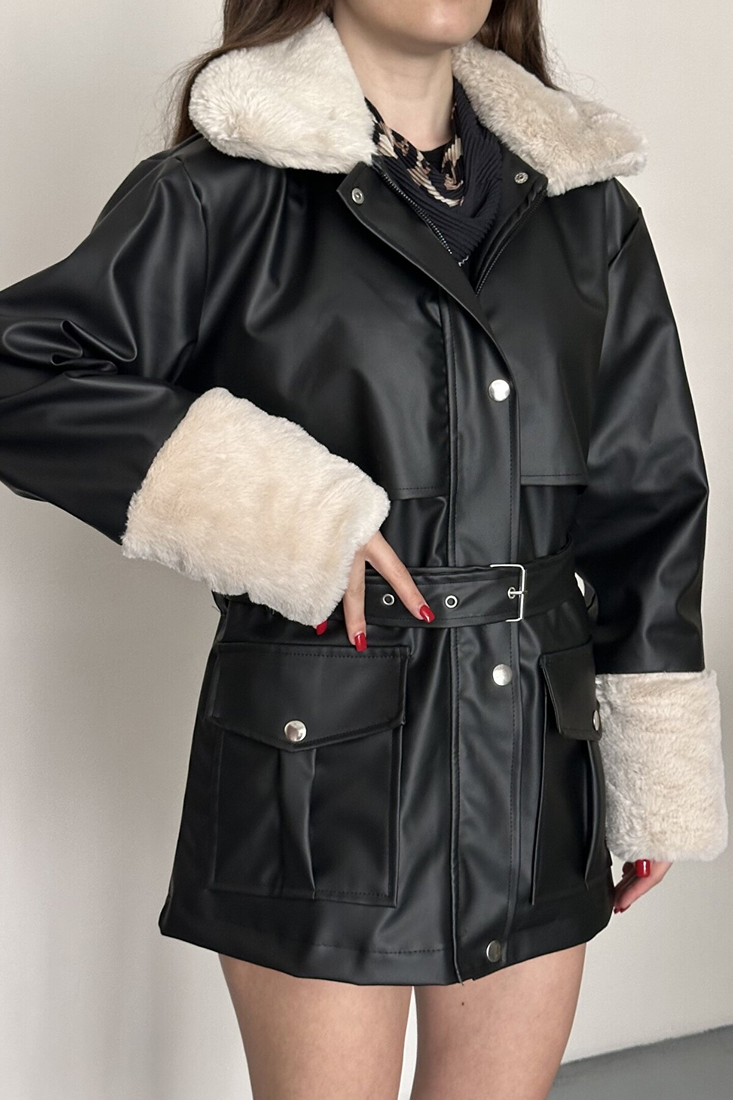 Şıklığı ve sıcaklığı bir arada sunan kadın siyah kemerli kürk yakalı suni deri mont, soğuk havalarda stilinden ödün vermek istemeyen kadınlar için özel olarak tasarlanmıştır.