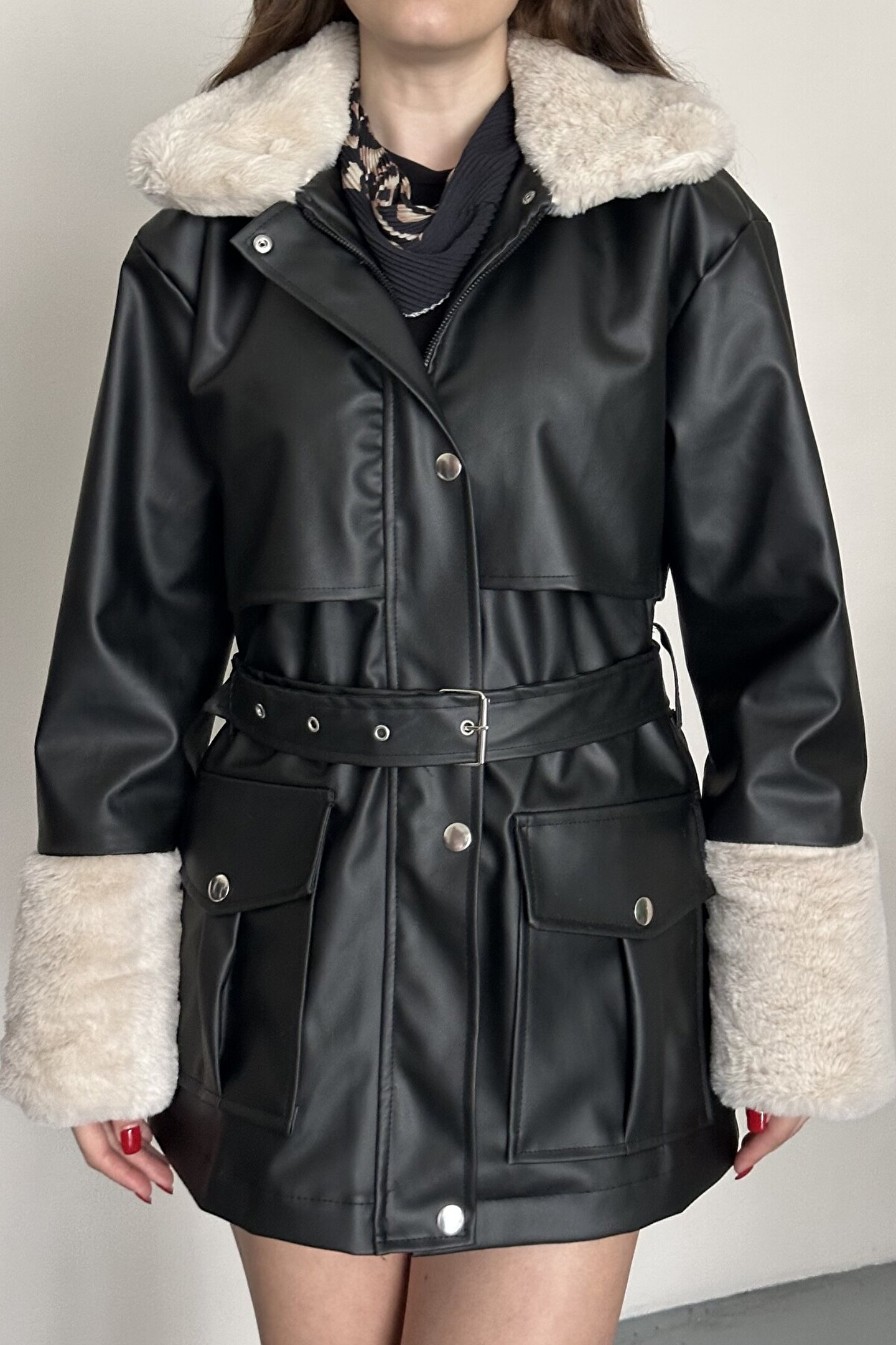 Şıklığı ve sıcaklığı bir arada sunan kadın siyah kemerli kürk yakalı suni deri mont, soğuk havalarda stilinden ödün vermek istemeyen kadınlar için özel olarak tasarlanmıştır.