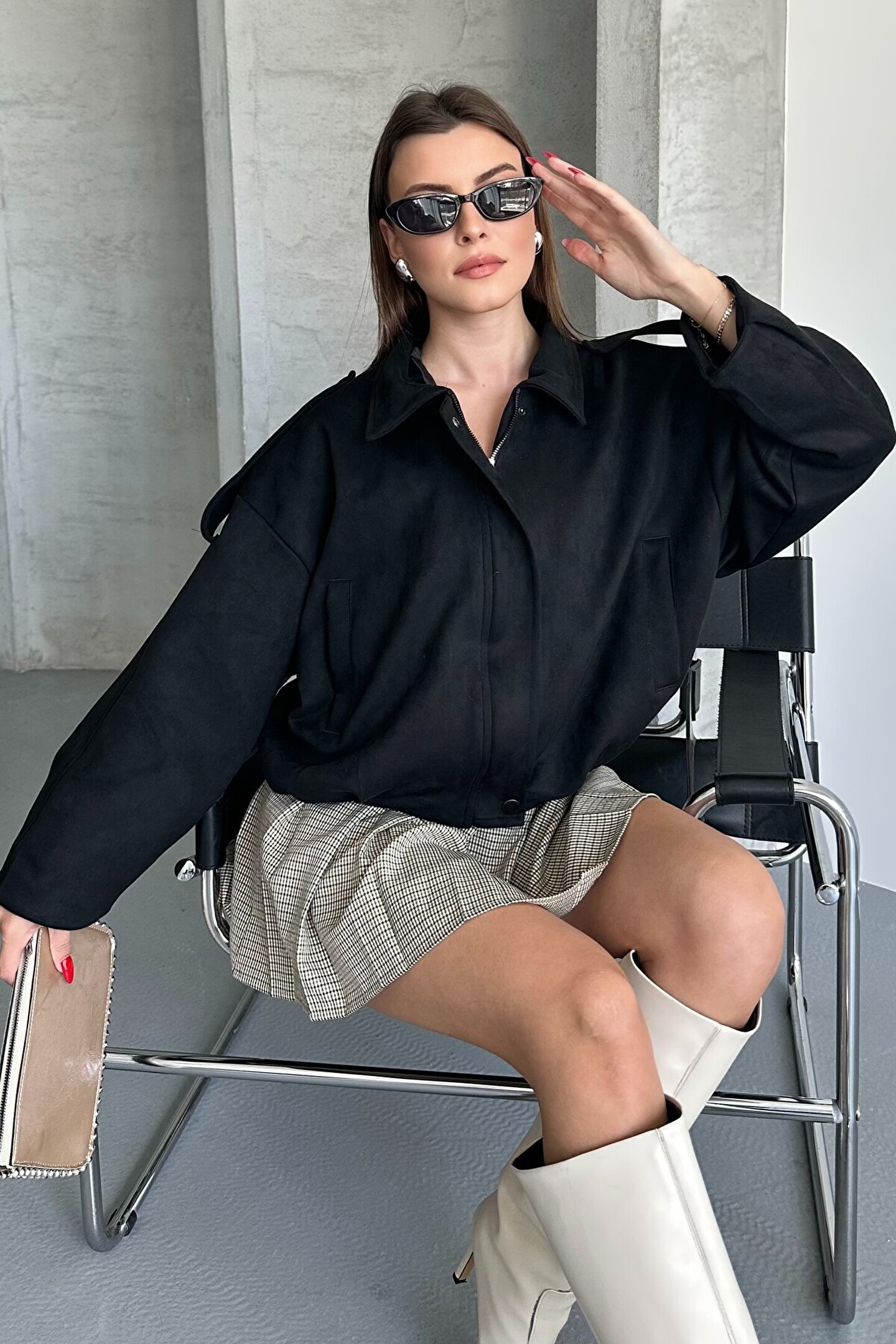 • Oversize kesimi ve yumuşak süet kumaşı ile bu kadın ceket, hem şıklığı hem konforu bir arada sunuyor.