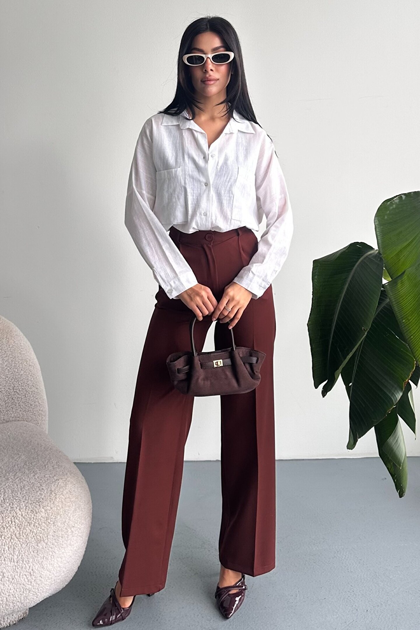 Kadın Palazzo Pantolon; Modern kesimi ve yüksek bel formuyla hem ofis hem günlük kombinlerin vazgeçilmez şık pantolon modeli.; ; Zamansız stil anlayışını modern kesimle buluşturan yüksek bel geniş paça kumaş pantolon, hem günlük kombinlerde hem ofis stilinde şık ve güçlü bir görünüm sunar.; ; Yüksek bel tasarımı vücut formunu dengelerken, akıcı ve düz paça kesimi bacak boyunu daha uzun ve zarif gösterir.; ; Minimal ve sade görünümü sayesinde farklı üst parçalarla kolayca kombinlenebilir.; ; Günlük kullanımda crop, basic tişört ve gömleklerle modern bir stil oluştururken, blazer ve topuklu ayakkabı ile klasik ofis şıklığına uyum sağlar.; ; Akıcı yapısı gün boyu konfor sunarken, güçlü silueti sayesinde stil sahibi ve modern bir duruş kazandırır.; ; Yüksek bel toparlayıcı form ; İspanyol paça modern kesim ; Akıcı ve rahat kumaş yapısı ; Günlük, ofis ve şehir stiline uygun ; Kolay kombinlenebilir zamansız tasarım ; Şık ve dengeli siluet görünümü ; Gardırobun en kurtarıcı parçalarından biri olacak bu model, hem klasik hem modern stil seven kadınlar için tasarlanmıştır.; ;