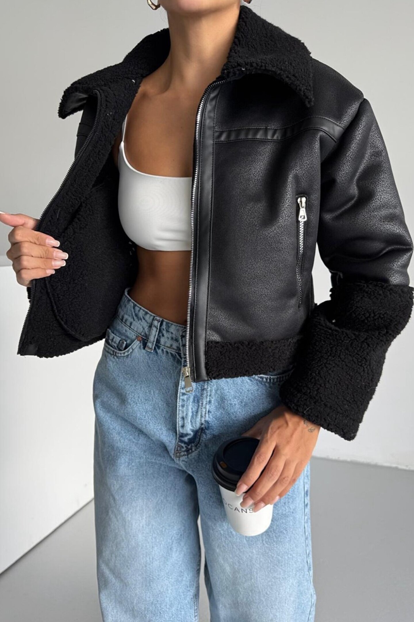 moda armanc Kadın Peluş Detaylı Crop Biker Suni Deri Mont