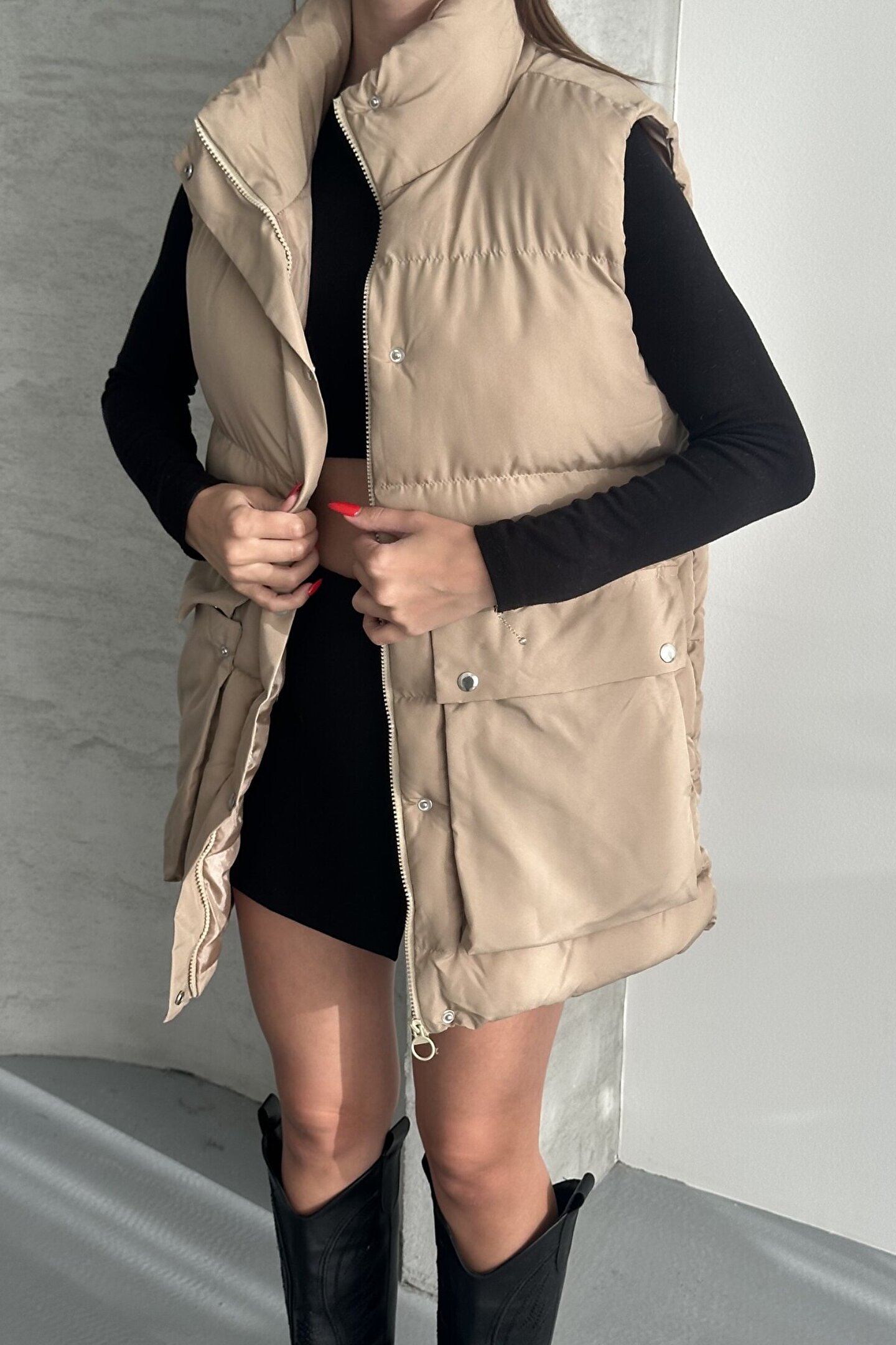 Günlük stilinize hem şıklık hem konfor katacak bu kadın uzun şişme yelek, modern tasarımı ve fonksiyonel detaylarıyla öne çıkıyor.; ; Yüksek yaka detayı ile rüzgâra karşı koruma sağlarken, çift büyük cepli yapısı sayesinde pratik kullanım sunar.; ; Hem spor hem şehir kombinlerine kolayca uyum sağlar.; ; Uzun kesim, modern ve şık duruş ; Ön kısımda fermuar ve düğme kapama ; Fonksiyonel ve geniş cepler ; Yumuşak doku ve sıcak tutan iç dolgu ; Günlük kullanım için idealdir ; Rahat kalıp, hareket özgürlüğü sunar ; Mevsim geçişlerinde ve serin havalarda kurtarıcı parça ; Jean, tayt, etek veya elbiselerle rahatlıkla kombinlenebilir.; Hem spor ayakkabılar hem botlarla şık bir görünüm elde edebilirsiniz.; ; Şehir hayatı, yürüyüş, okul, ofis ve hafta sonu kombinleriniz için mükemmel bir tercih! ;