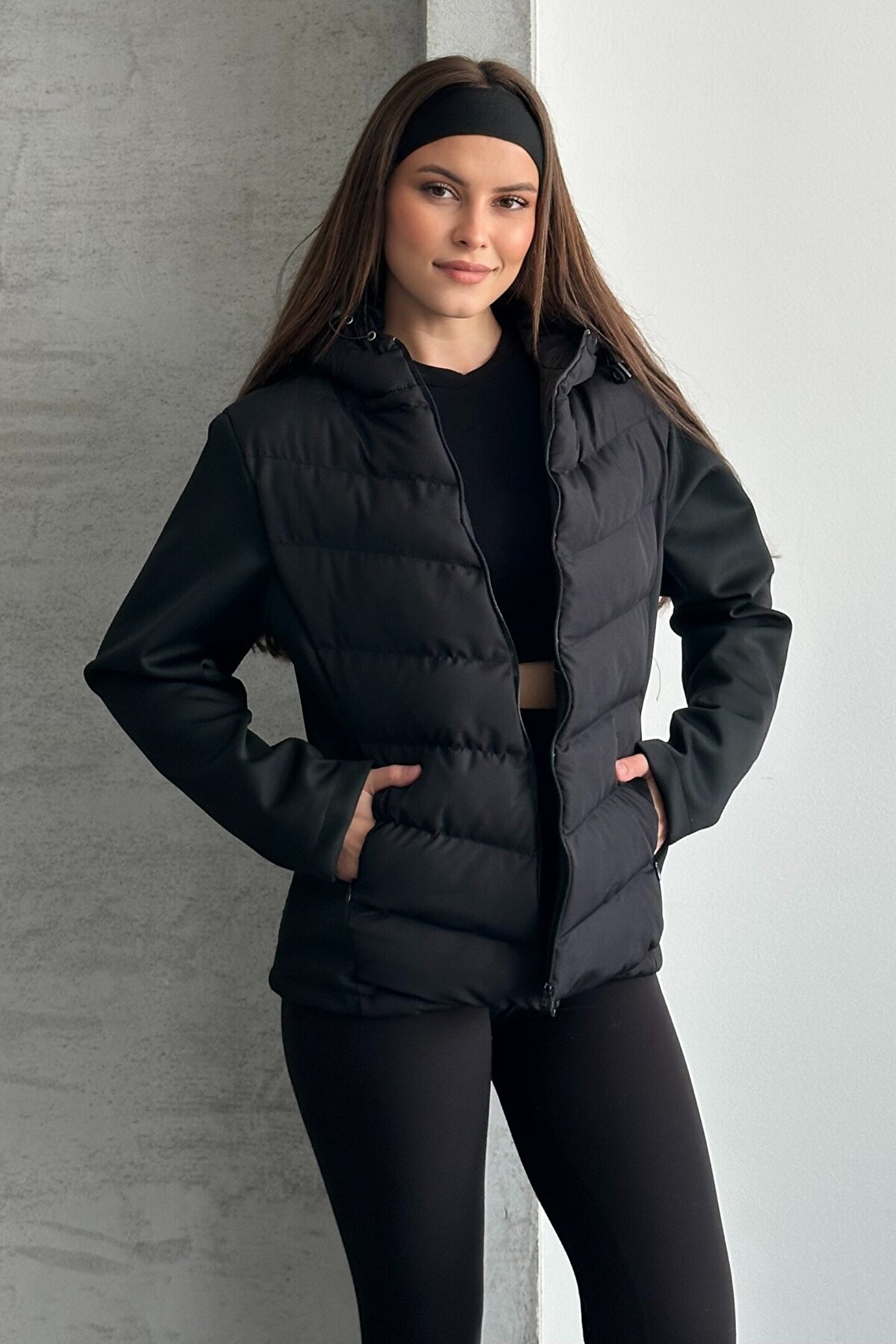moda armanc Kadın Siyah Kapüşonlu Termal Şişme Mont - ZR Range Rover Mom Kontrast Ceket