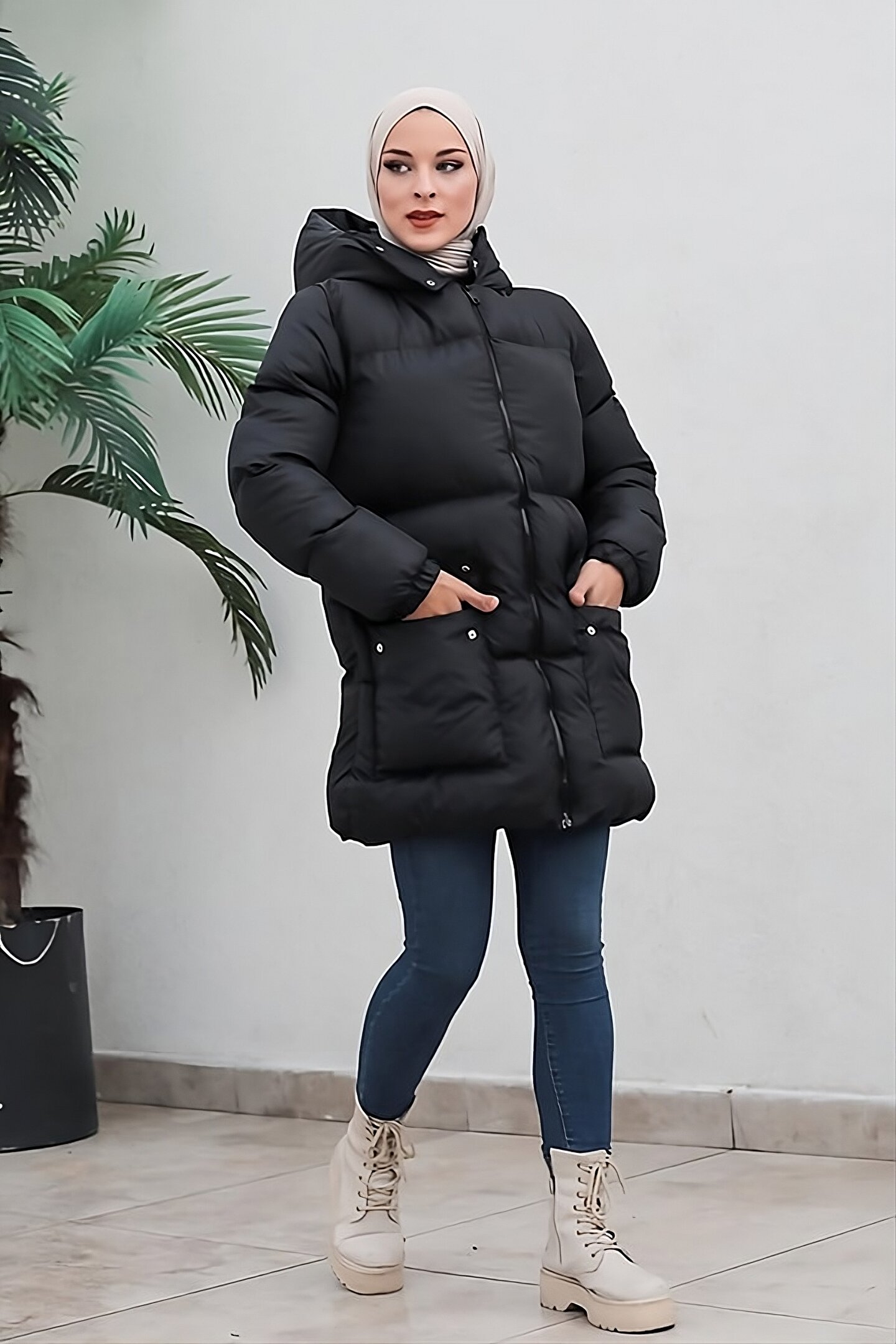 moda armanc Kadın Siyah Kapüşonlu Uzun Şişme Mont – Fermuarlı, Büyük Cepli, Kışlık Dolgulu Puffer Mont