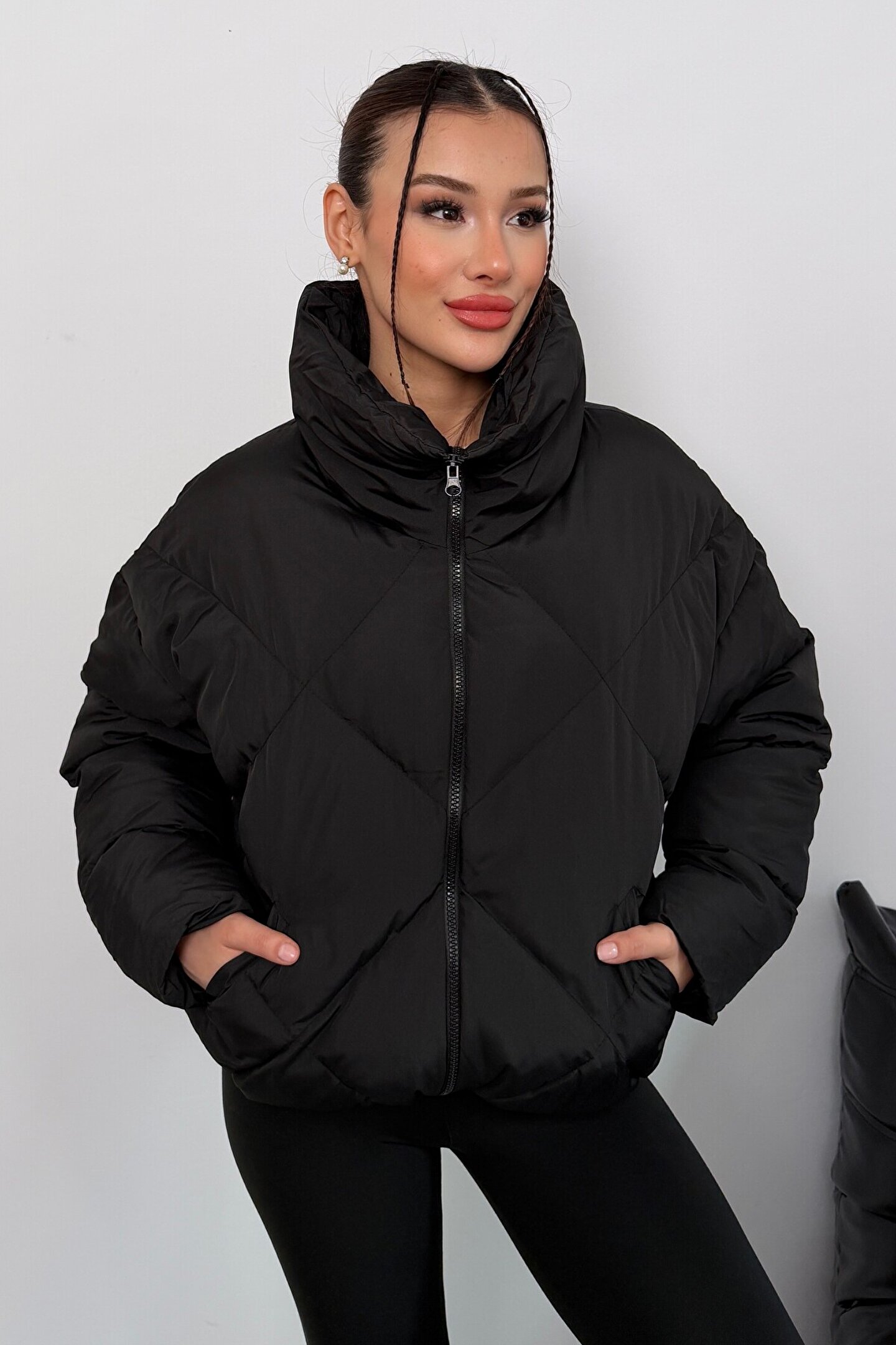 moda armanc Kadın Siyah Oversize Şişme Mont - Yüksek Yaka, Baklava Desenli
