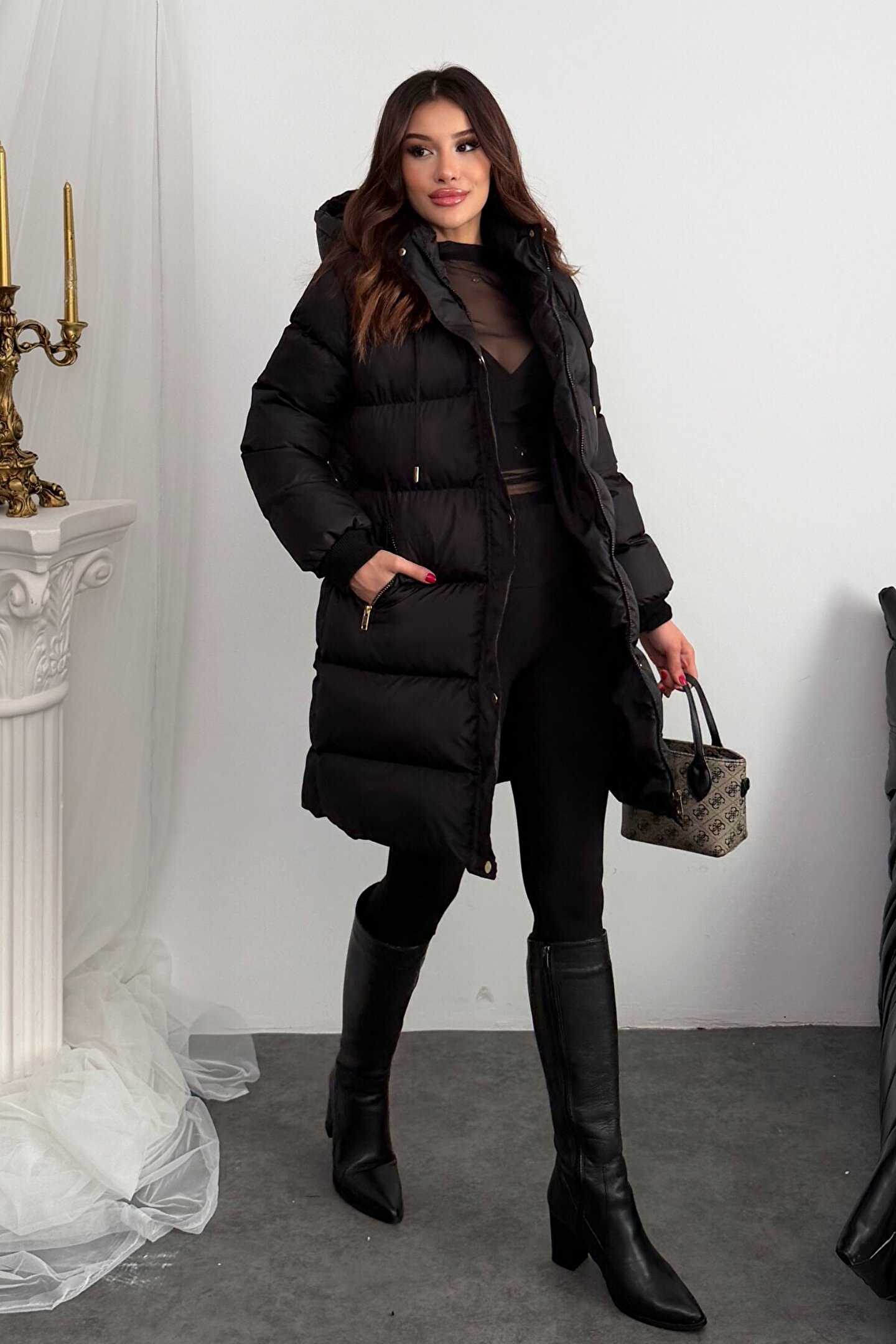 moda armanc Kadın Siyah Uzun Kapüşonlu Şişme Mont – Oversize Kışlık Gold Düğmeli