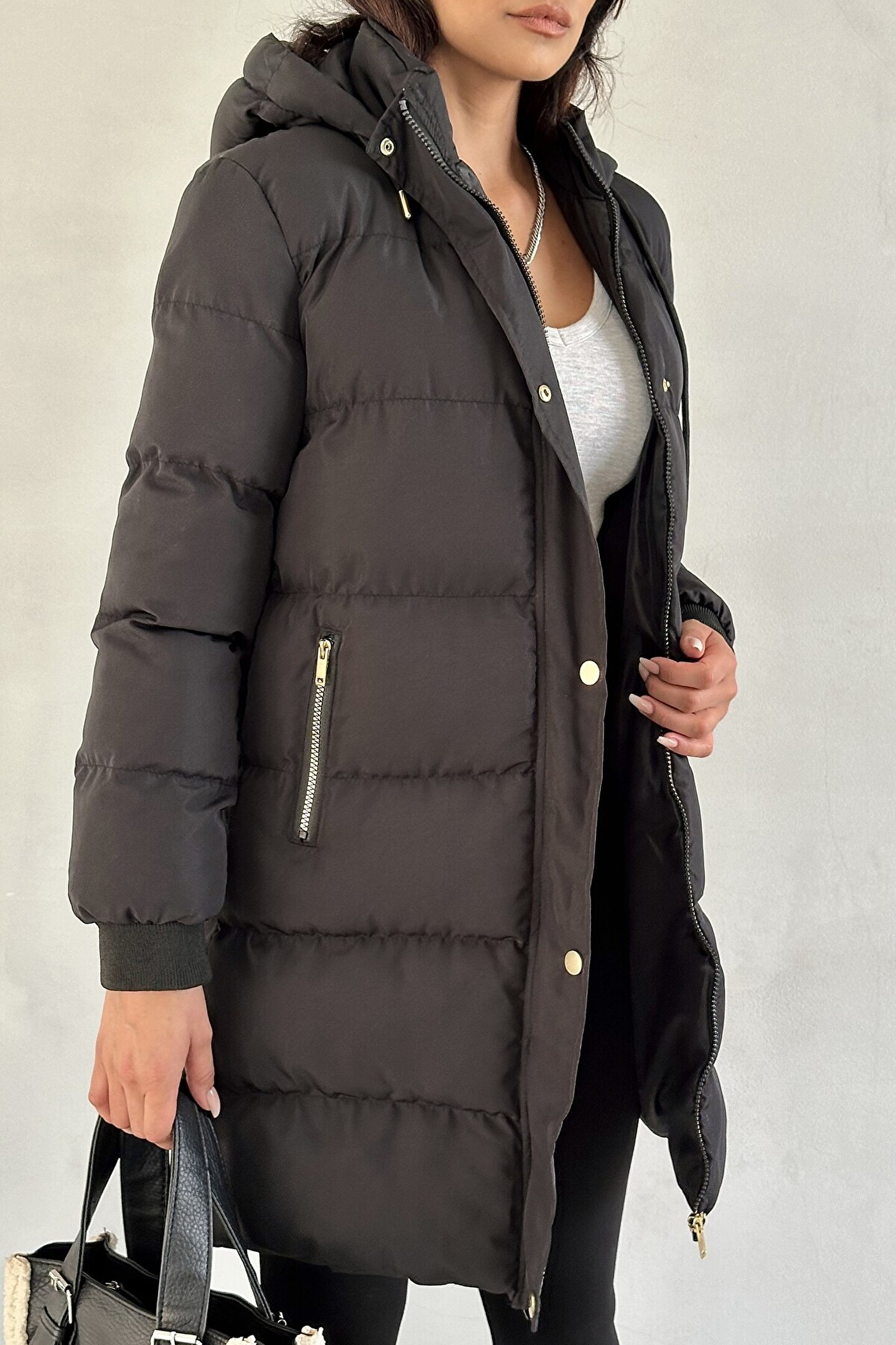 moda armanc Kadın Siyah Uzun Şişme Mont - Kapüşonlu, Gold Detaylı