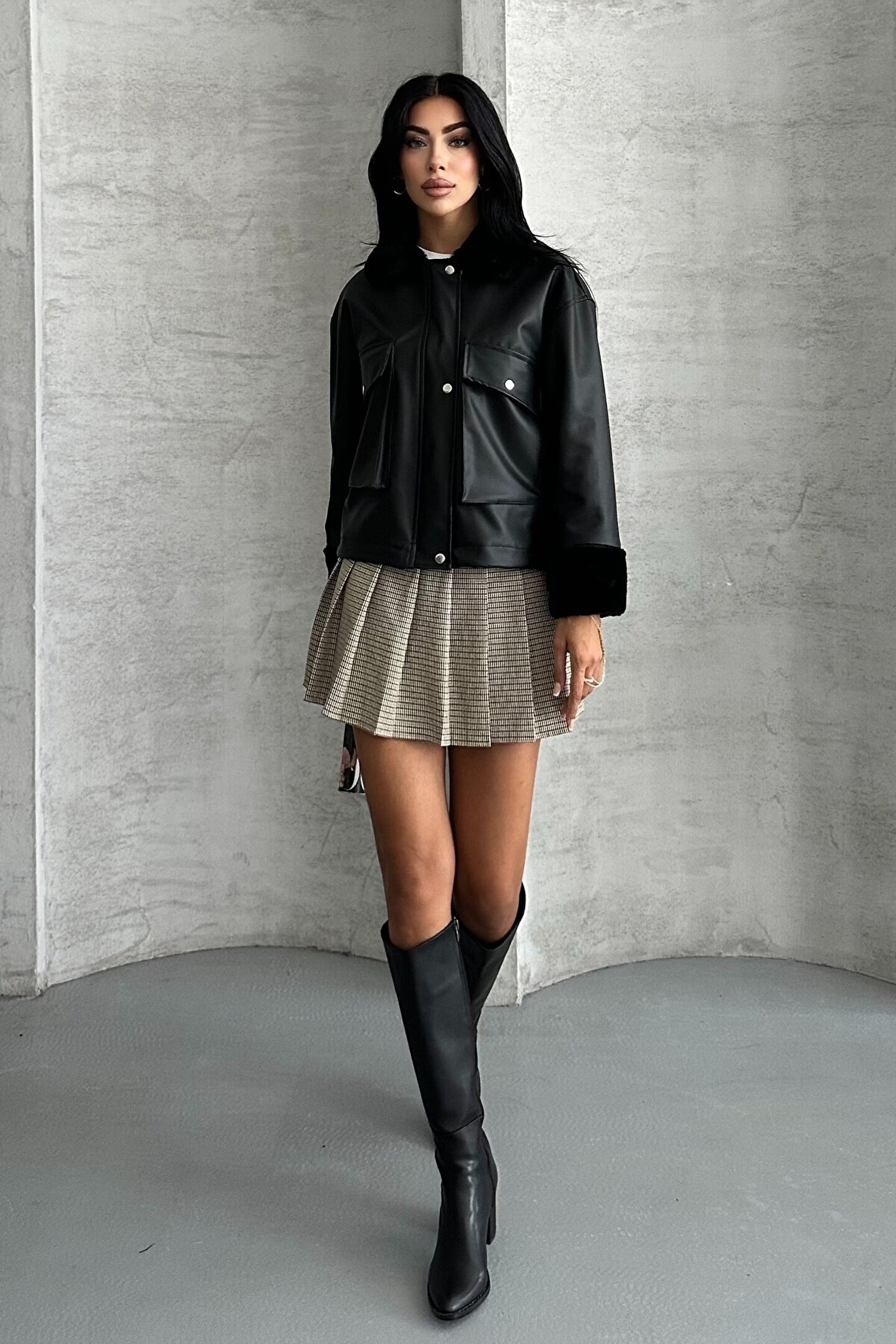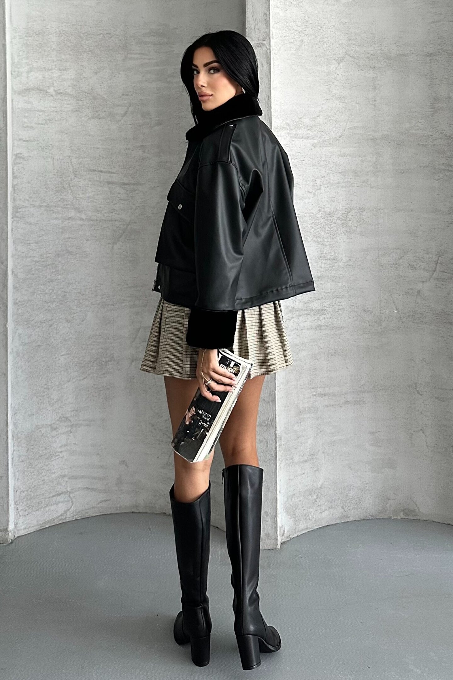 • Şehirli, modern ve özgüvenli görünümün anahtar parçası olan bu ceket, oversize kesimi, peluş astarı ve çarpıcı deri dokusu ile sonbahar–kış modasında öne çıkıyor.