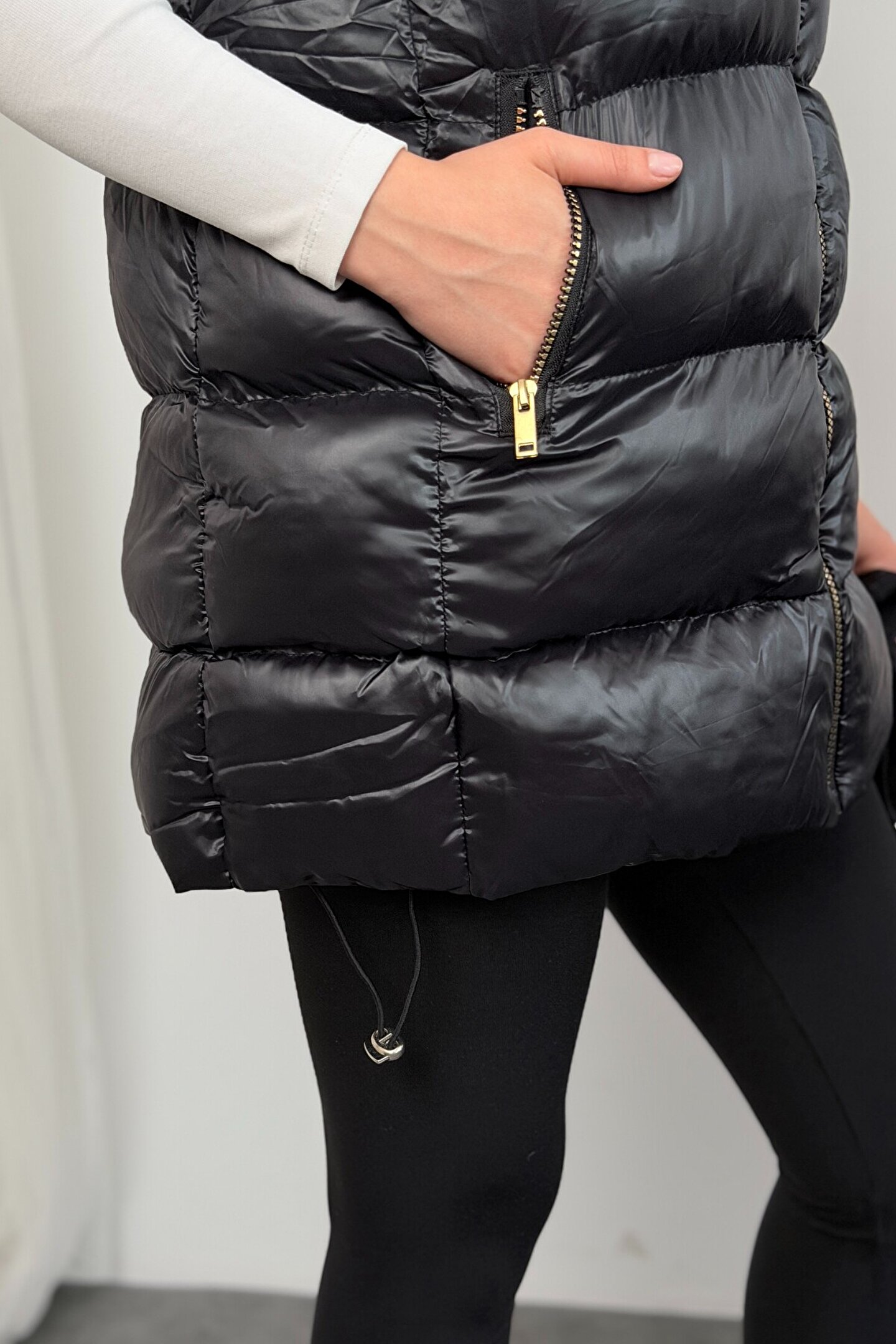moda armanc Kadın Uzun Siyah Kapüşonlu Şişme Yelek – Astronot Yaka, Su Geçirmez, Oversize