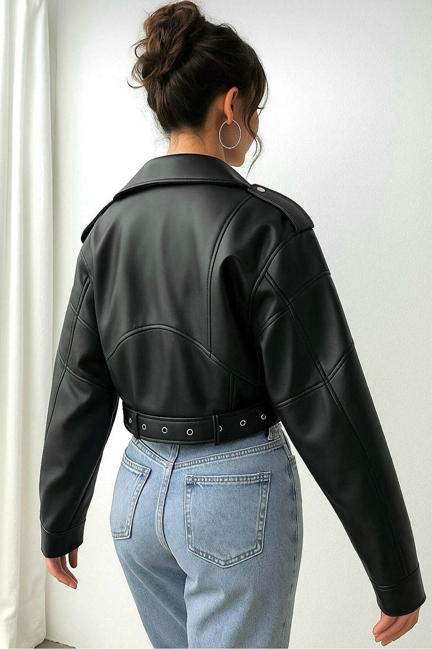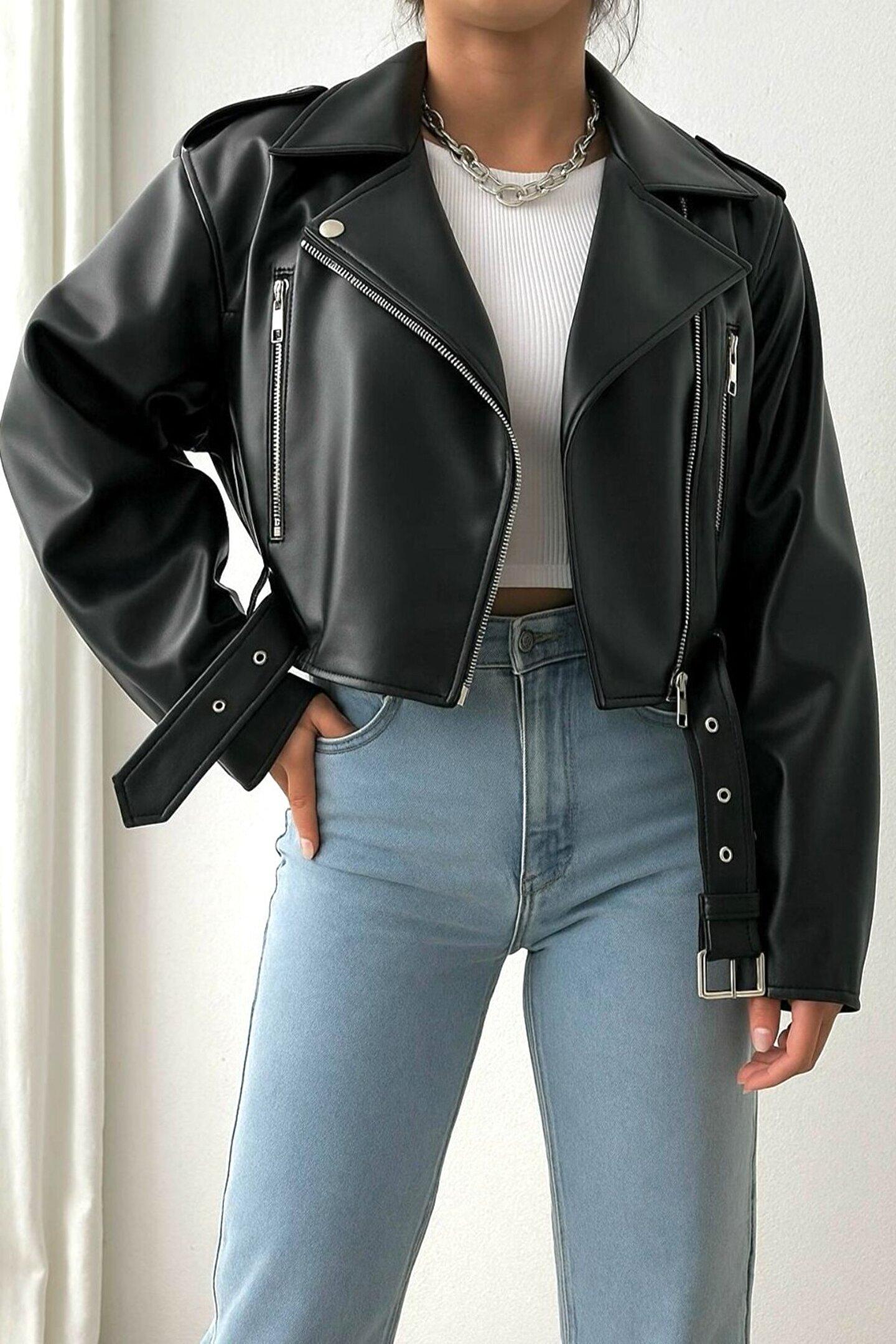 moda armanc Kemerli Siyah Crop Deri Ceket