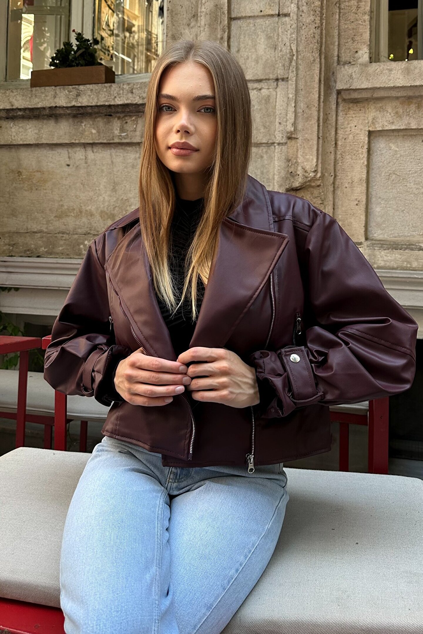 moda armanc Suni Deri Balon Kol Bordo Biker Ceket