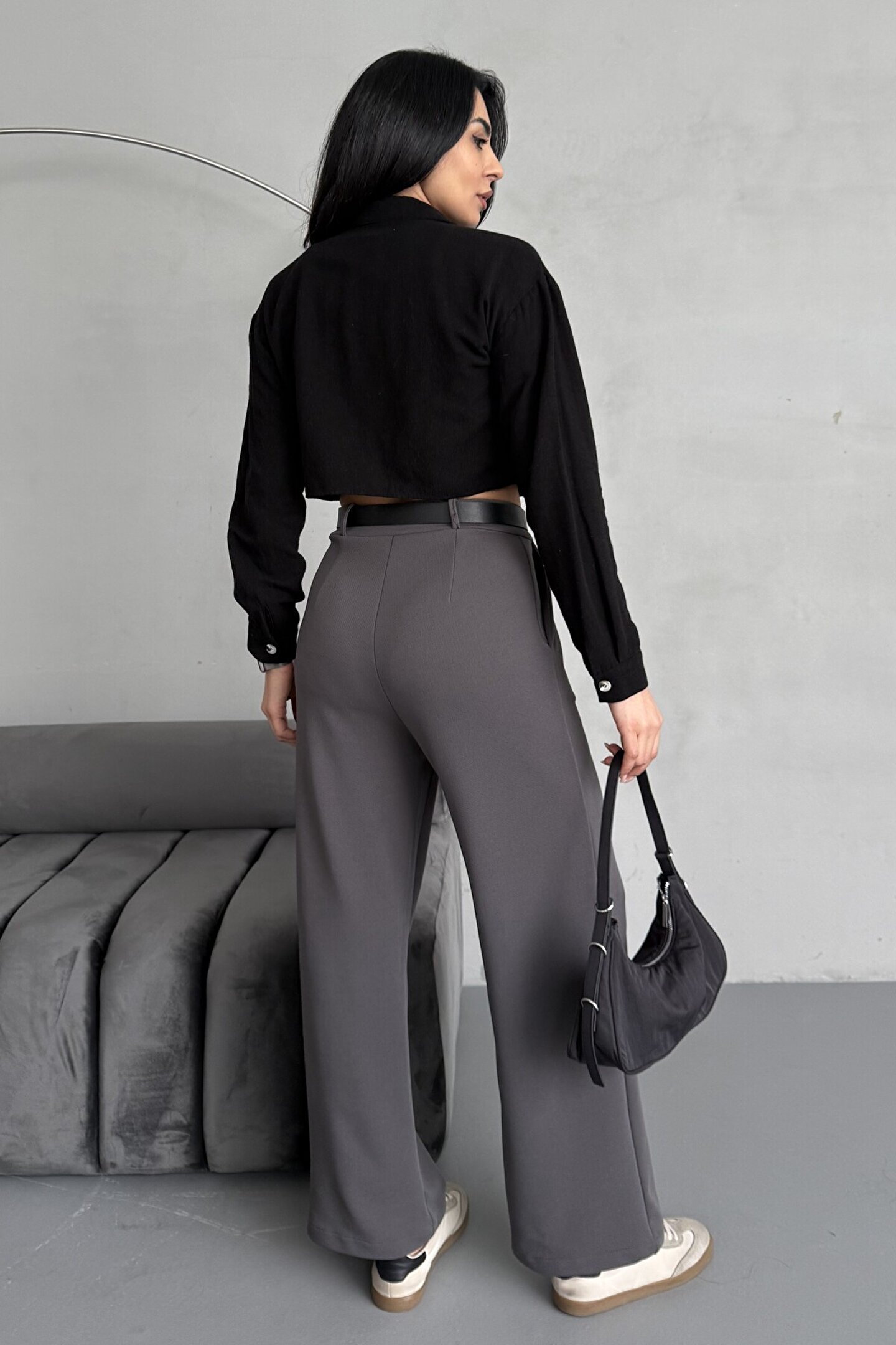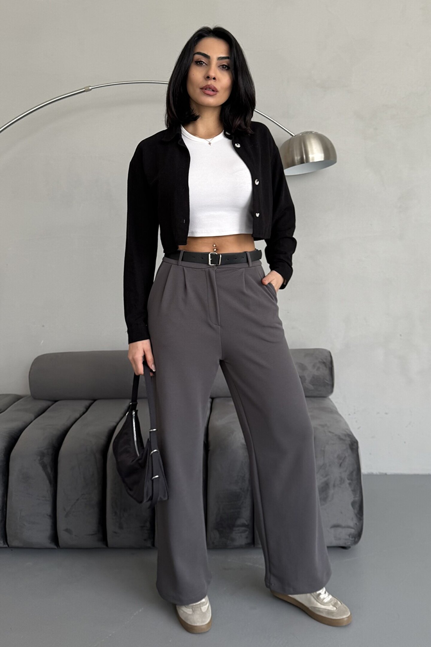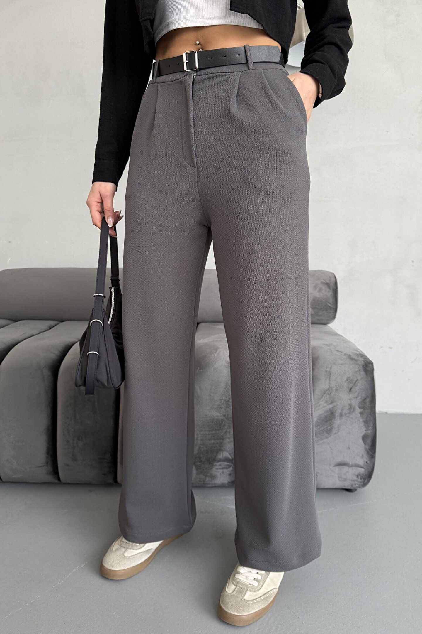 moda armanc Yüksek Bel Bol Paça Kemerli Likralı Kadın Palazzo Pantolon - Gri