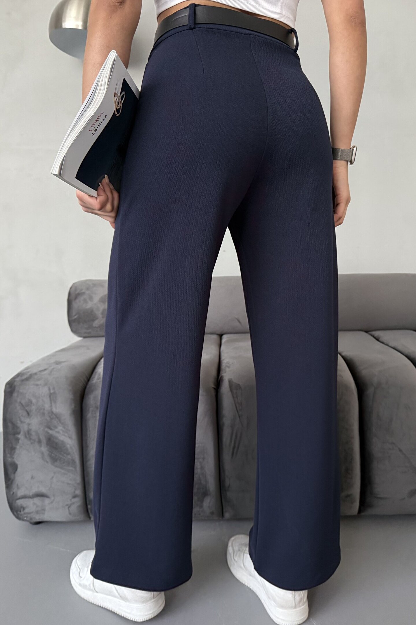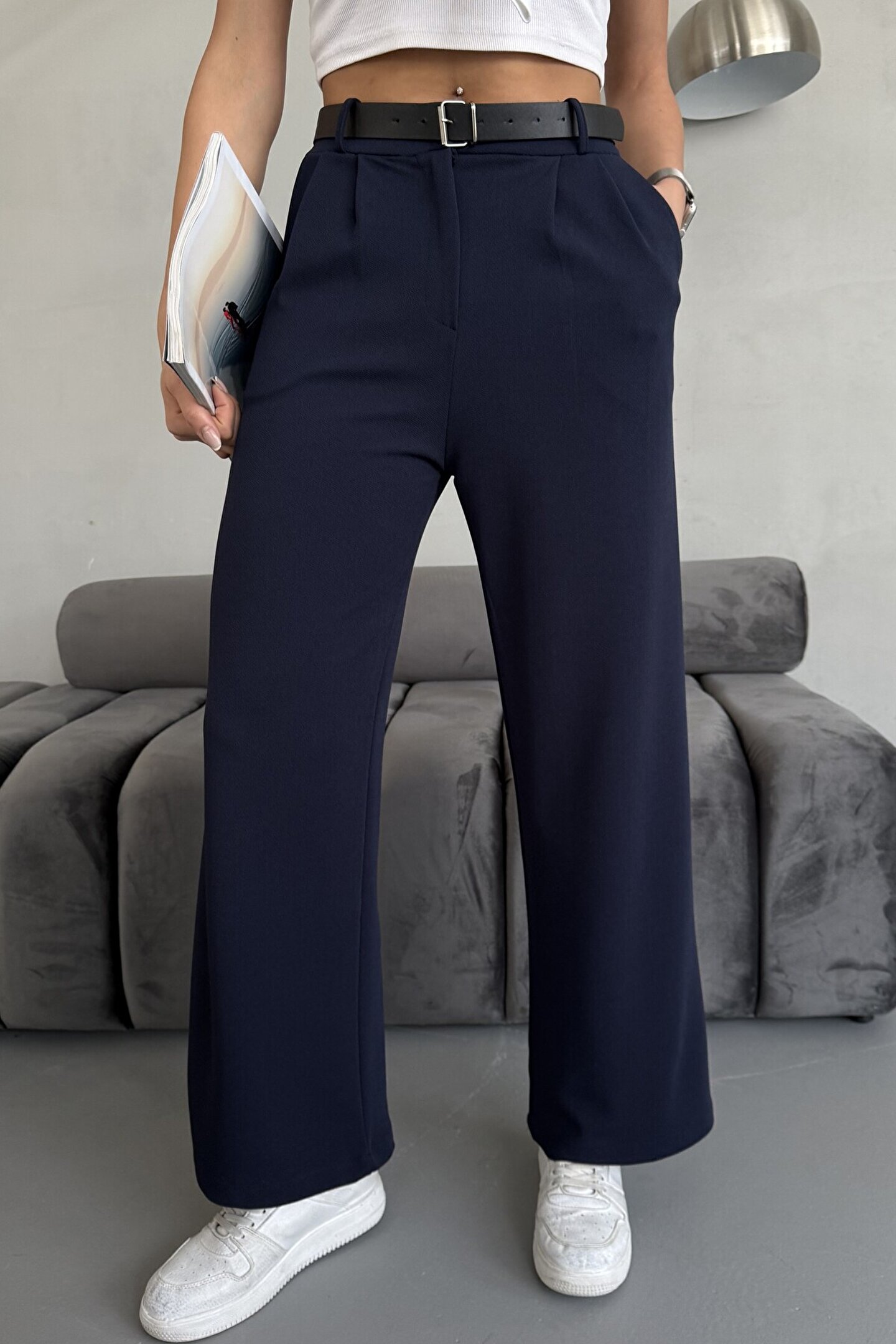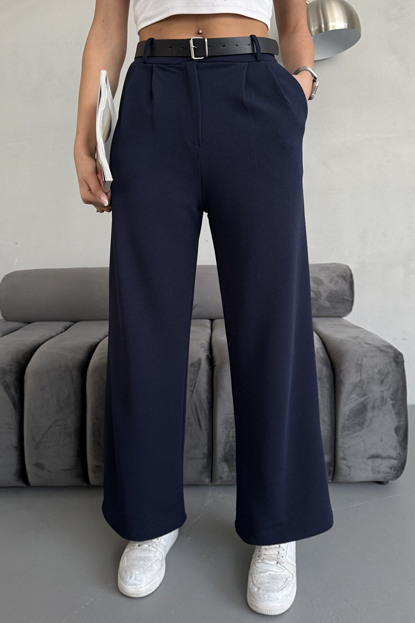 moda armanc Yüksek Bel Bol Paça Kemerli Likralı Kadın Palazzo Pantolon - Lacivert