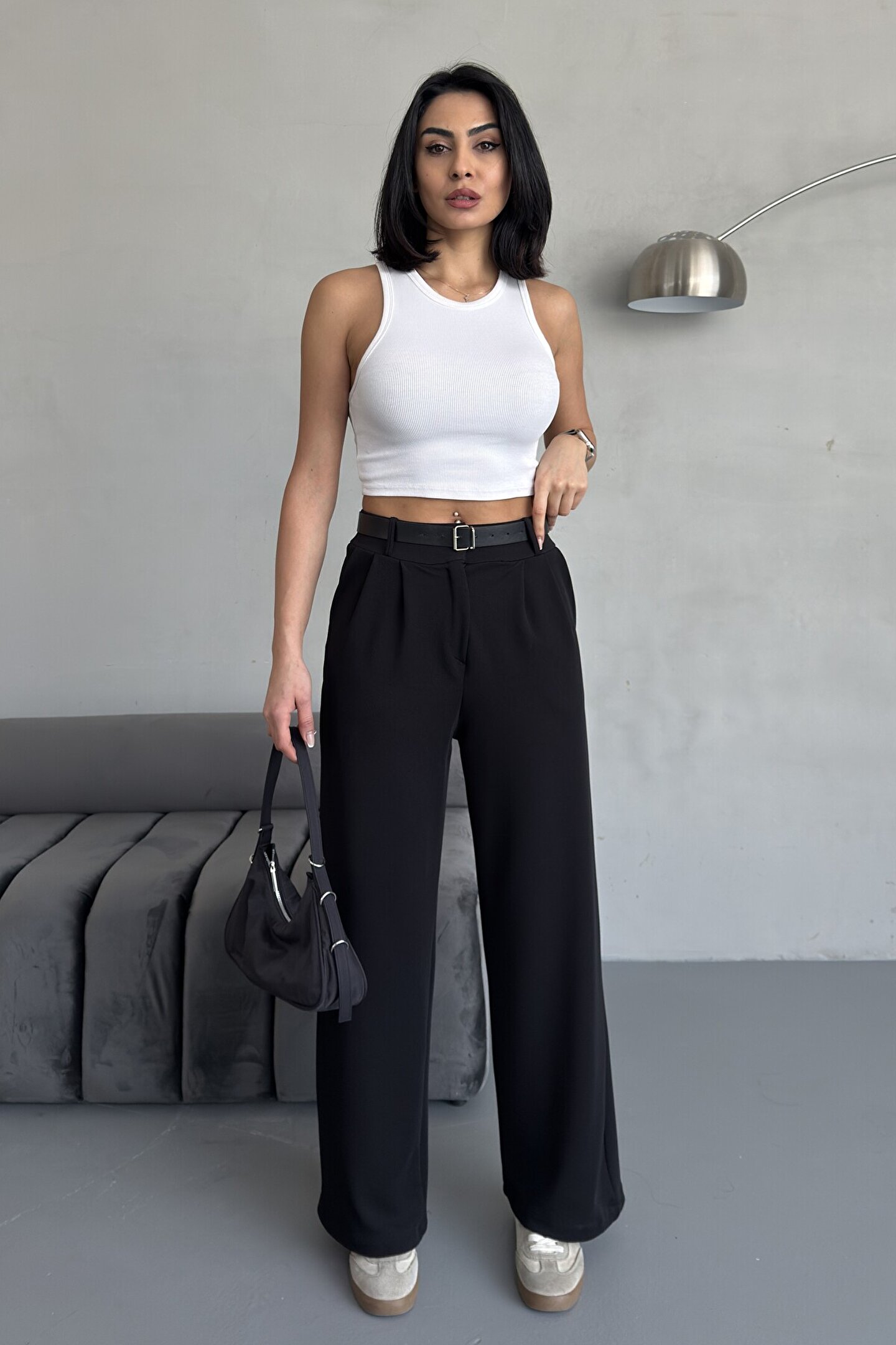 moda armanc Yüksek Bel Bol Paça Kemerli Likralı Kadın Palazzo Pantolon - Siyah