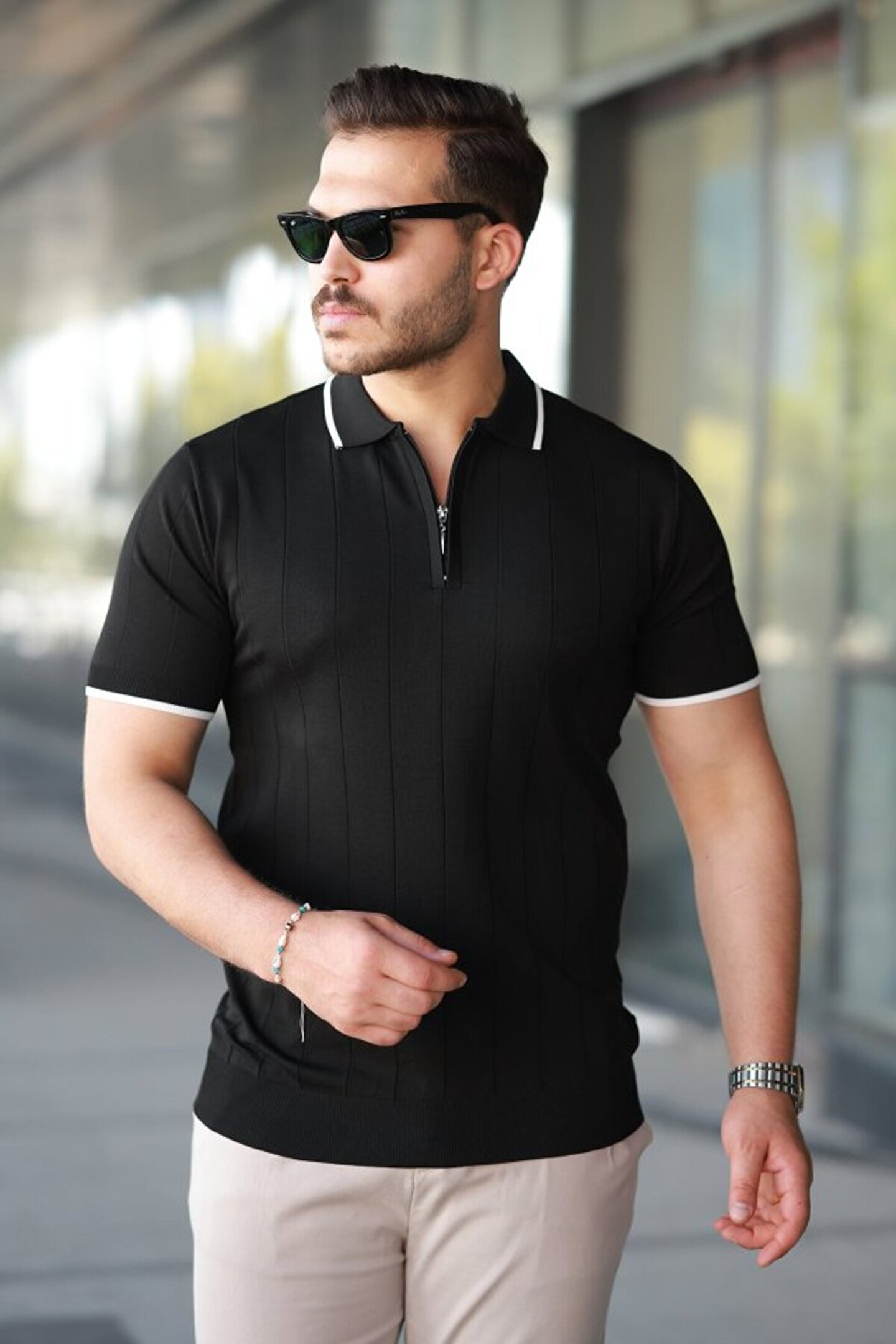 Moda Asmira Erkek Fermuar Yakalı çizgi Dokulu Kısa Kollu Tişört