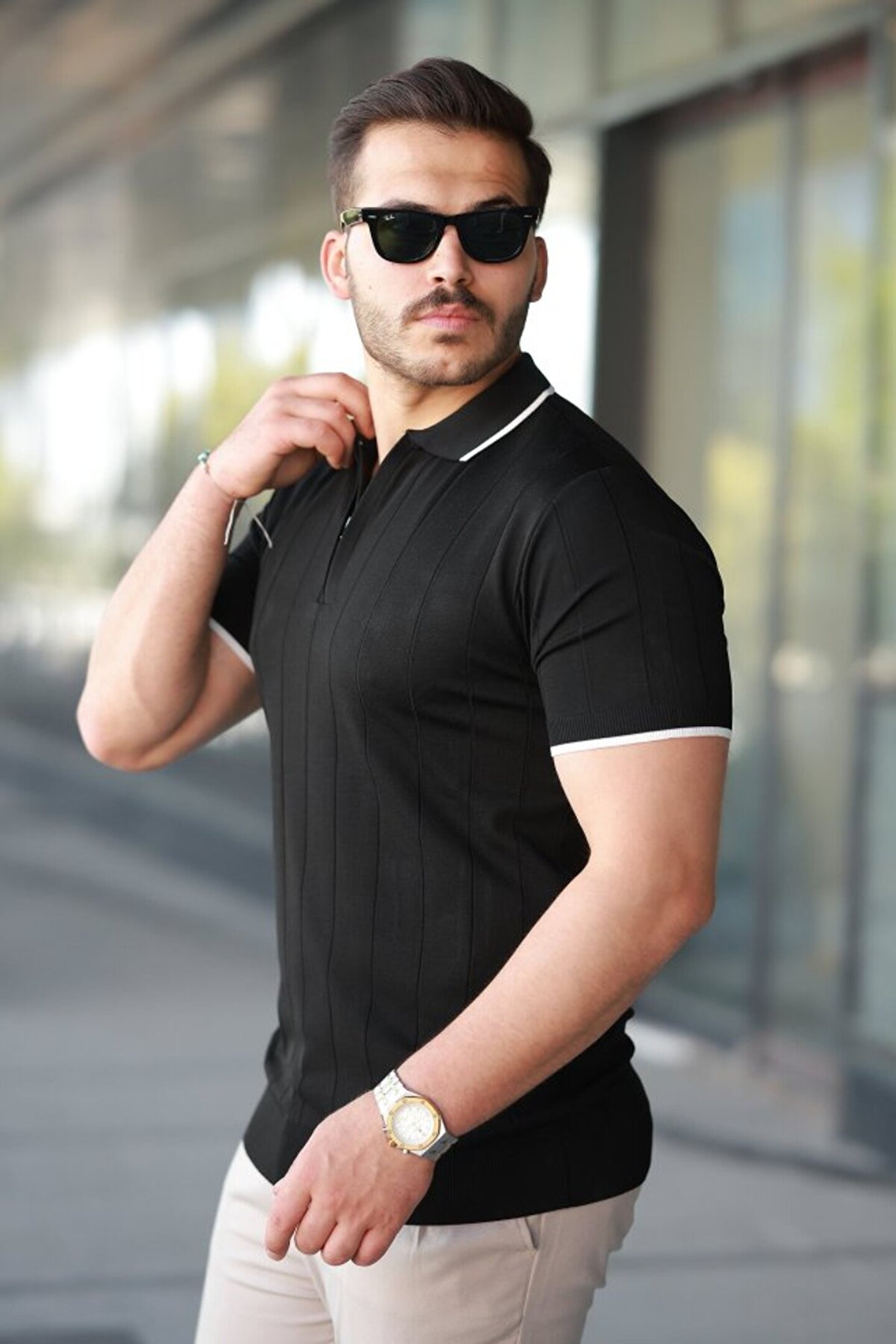 Erkek Fermuar Yakalı çizgi Dokulu Kısa Kollu Tişört