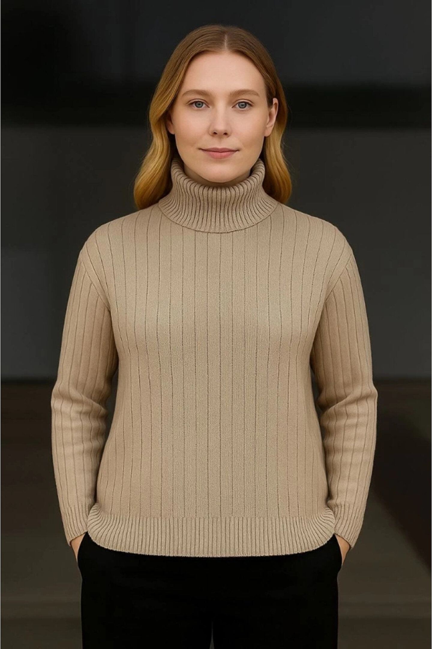 MODA Balıkcı Yaka Bağazlı Triko Kazak Pamuklu Kalın Fitilli Dokuma - Bej
