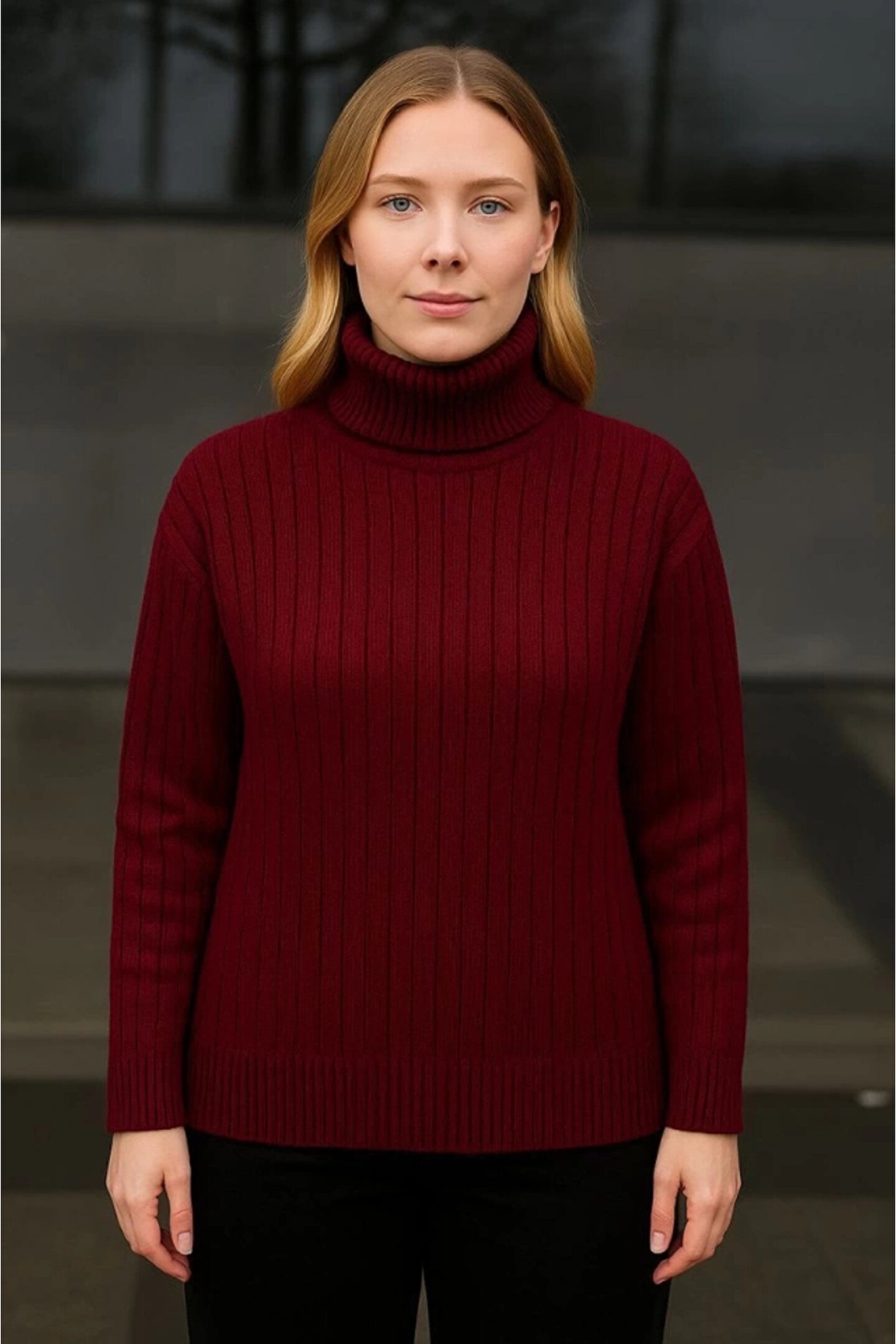 MODA Balıkcı Yaka Bağazlı Triko Kazak Pamuklu Kalın Fitilli Dokuma - Bordo