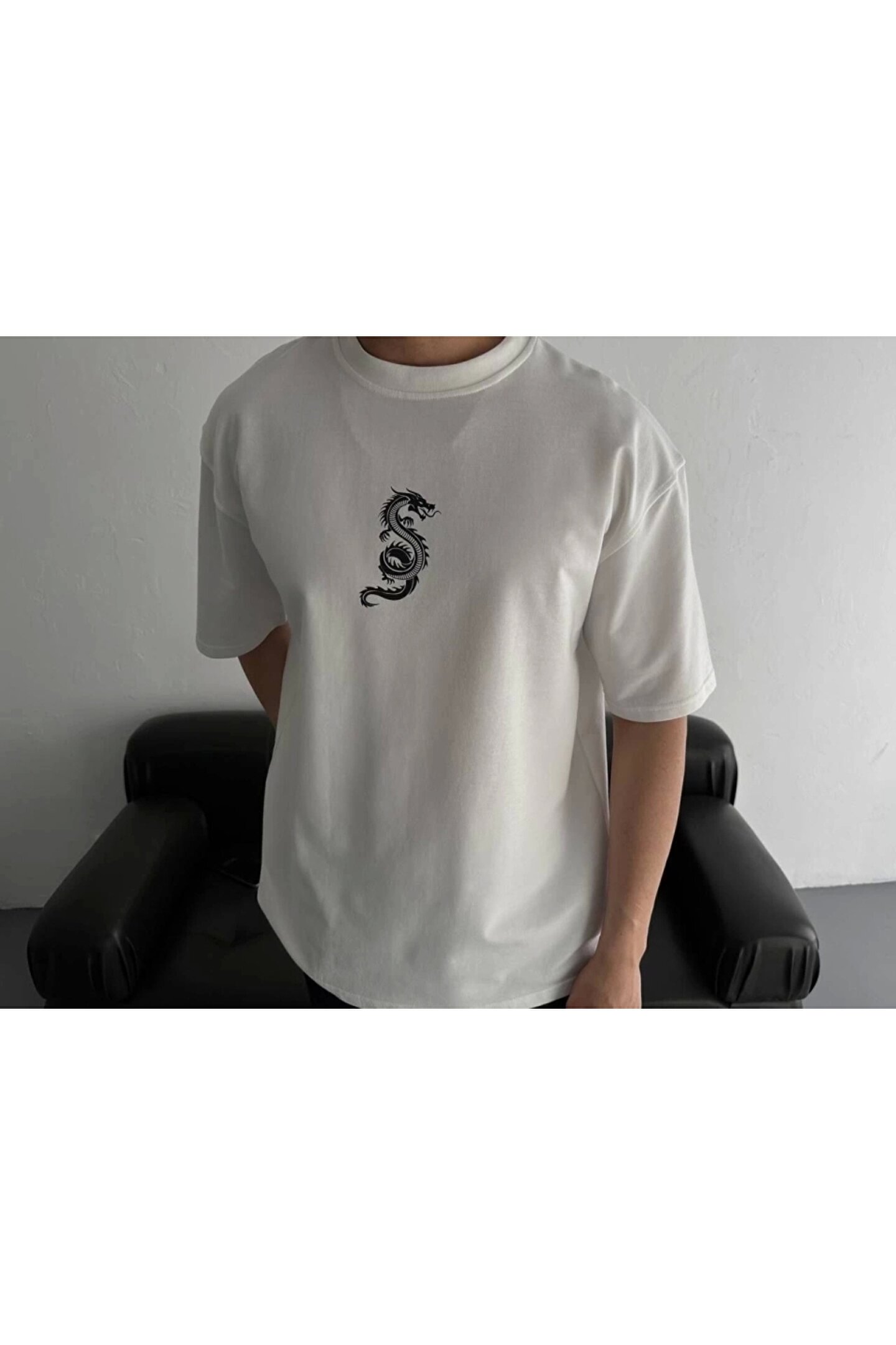 Baskılı Oversize Bisiklet Yaka T-shirt - Beyaz